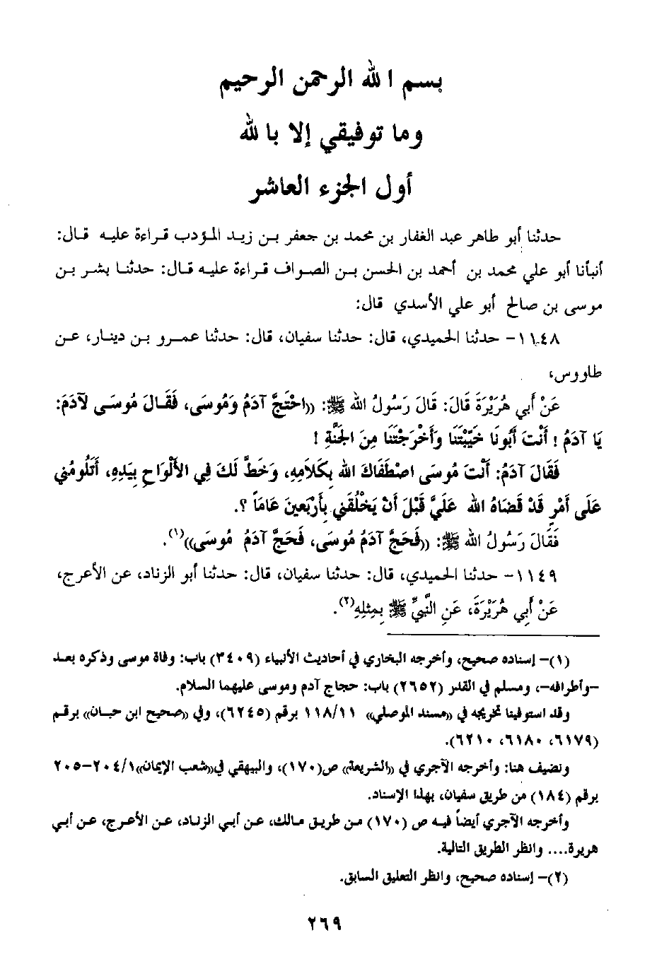 1148 - حَدَّثَنَا الْحُمَيْدِيُّ قَالَ: ثنا سُفْيَانُ، قَالَ: ثنا عَمْرُو بْنُ دِينَارٍ، عَنْ طَاوُسٍ، عَنْ أَبِي هُرَيْرَةَ، قَالَ: قَالَ رَسُولُ اللَّهِ صَلَّى اللهُ عَلَيْهِ وَسَلَّمَ: " §احْتَجَّ آدَمُ وَمُوسَى، فَقَالَ مُوسَى لِآدَمَ: يَا آدَمُ أَنْتَ أَبُونَا، خَيَّبْتَنَا وَأَخْرَجْتَنَا مِنَ الْجَنَّةِ، فَقَالَ لَهُ آدَمُ: أَنْتَ مُوسَى اصْطَفَاكَ اللَّهُ بِكَلَامِهِ، وَخَطَّ لَكَ فِي الْأَلْوَاحِ بِيَدِهِ، أَتَلُومُنِي عَلَى أَمْرٍ قَدْ قَضَاهُ اللَّهُ عَلَيَّ قَبْلَ أَنْ يَخْلُقَنِي بِأَرْبَعِينَ عَامًا؟ " فَقَالَ رَسُولُ اللَّهِ صَلَّى اللهُ عَلَيْهِ وَسَلَّمَ: «فَحَجَّ آدَمُ مُوسَى»