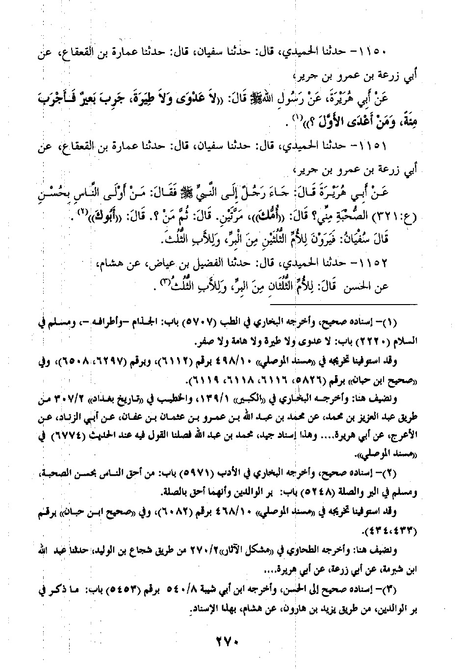1151 - حَدَّثَنَا الْحُمَيْدِيُّ قَالَ: ثنا سُفْيَانُ، قَالَ: ثنا عُمَارَةُ بْنُ الْقَعْقَاعِ، عَنْ أَبِي زُرْعَةَ بْنِ عَمْرِو بْنِ جَرِيرٍ، عَنْ أَبِي هُرَيْرَةَ، قَالَ: جَاءَ رَجُلٌ إِلَى النَّبِيِّ صَلَّى اللهُ عَلَيْهِ وَسَلَّمَ، فَقَالَ: §مَنْ أَوْلَى النَّاسِ بِحُسْنِ الصُّحْبَةِ مِنِّي؟ قَالَ: «أُمُّكَ» ، قَالَ: «أُمُّكَ» ، ثُمْ مَنْ؟ قَالَ: «أَبُوكَ» قَالَ سُفْيَانُ: «فَيَرَوْنَ أَنَّ لِلْأُمِّ الثُّلُثَيْنِ مِنَ الْبِرِّ وَلِلْأَبِّ الثُّلُثَ»
