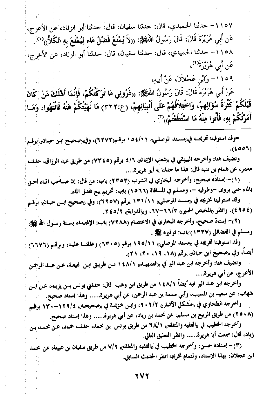 1157 - حَدَّثَنَا الْحُمَيْدِيُّ قَالَ: ثنا سُفْيَانُ، قَالَ: ثنا أَبُو الزِّنَادِ، عَنِ الْأَعْرَجِ، عَنْ أَبِي هُرَيْرَةَ، قَالَ: قَالَ رَسُولُ اللَّهِ صَلَّى اللهُ عَلَيْهِ وَسَلَّمَ: «§لَا يُمْنَعْ فَضْلُ مَاءٍ لِيُمْنَعَ بِهِ الْكَلَأُ»