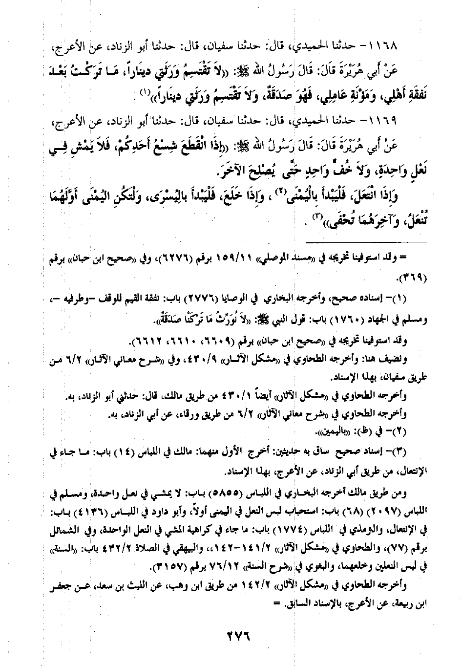 1169 - حَدَّثَنَا الْحُمَيْدِيُّ قَالَ: ثنا سُفْيَانُ، قَالَ: ثنا أَبُو الزِّنَادِ، عَنِ الْأَعْرَجِ، عَنْ أَبِي هُرَيْرَةَ، قَالَ: قَالَ رَسُولُ اللَّهِ صَلَّى اللهُ عَلَيْهِ وَسَلَّمَ: «§إِذَا انْقَطَعَ شِسْعُ أَحَدِكُمْ فَلَا يَمِشِ فِي نَعْلٍ وَاحِدَةٍ، وَلَا خُفٍّ وَاحِدٍ حَتَّى يُصْلِحَ الْآخَرَ، وَإِذَا انْتَعَلَ فَلْيَبْدَأْ بِالْيَمِينِ، وَإِذَا خَلَعَ فَلْيَبْدَأْ بِالْيُسْرَى، وَلَتْكُنِ الْيُمْنَى أَوَّلَهُمَا تَنْعَلُ وَآخَرَهُمَا تُحْفِي»