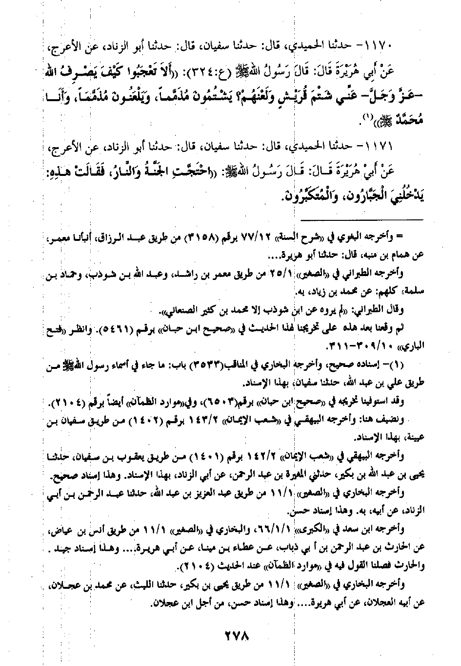 1170 - حَدَّثَنَا الْحُمَيْدِيُّ قَالَ: ثنا سُفْيَانُ، قَالَ: ثنا أَبُو الزِّنَادِ، عَنِ الْأَعْرَجِ، عَنْ أَبِي هُرَيْرَةَ، قَالَ: قَالَ رَسُولُ اللَّهِ صَلَّى اللهُ عَلَيْهِ وَسَلَّمَ: «§أَلَا تَعْجَبُوا كَيْفَ يَصْرِفُ اللَّهُ عَزَّ وَجَلَّ عَنِّي شَتْمَ قُرَيْشٍ، وَلَعْنَهُمْ يَشْتُمُونَ مُذَمَّمًا، وَيَلْعَنُونَ مُذَمَّمًا، وَأنَا مُحَمَّدٌ صَلَّى اللهُ عَلَيْهِ وَسَلَّمَ»