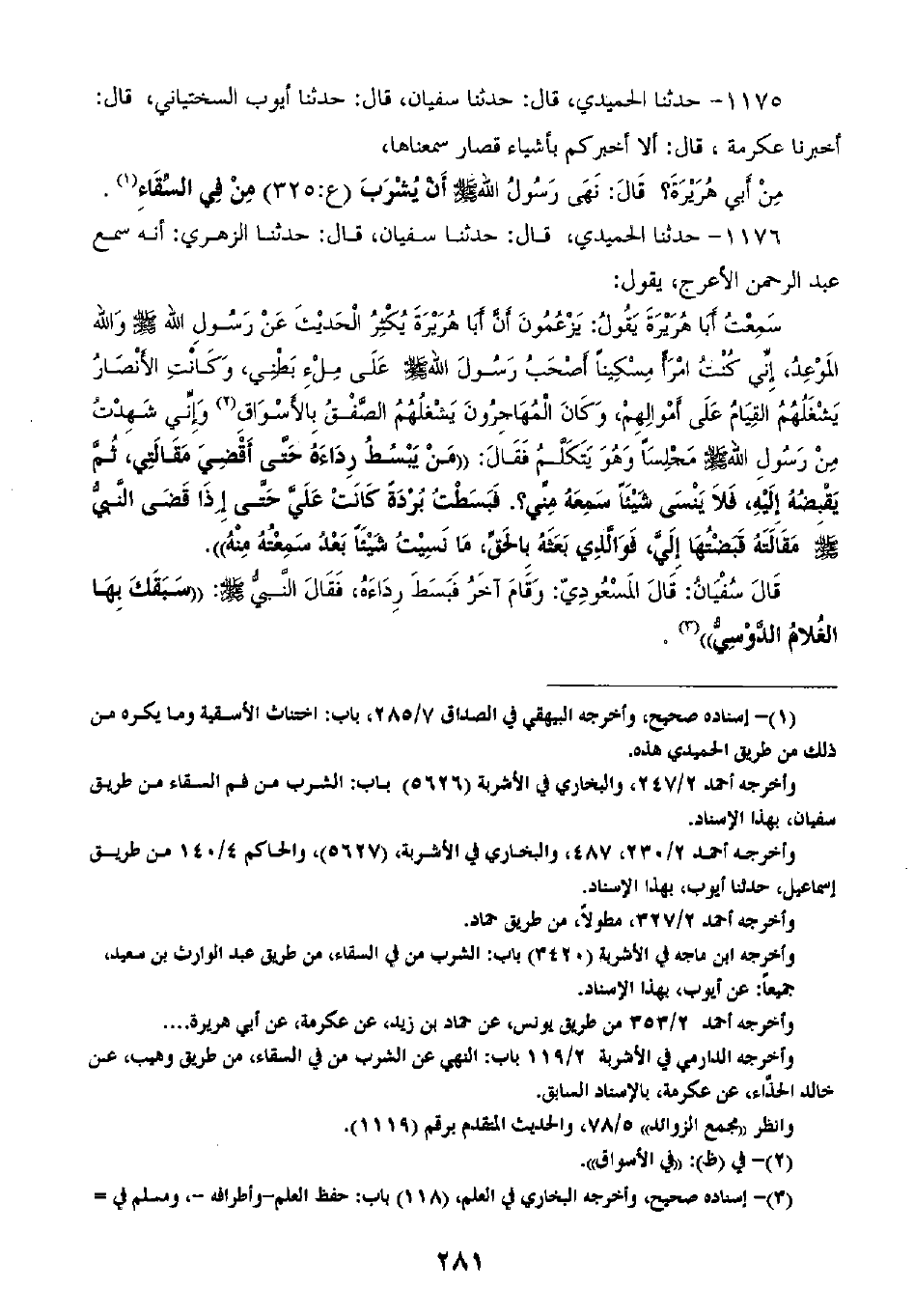1176 - حَدَّثَنَا الْحُمَيْدِيُّ قَالَ: ثنا سُفْيَانُ، قَالَ: ثنا الزُّهْرِيُّ، أَنَّهُ سَمِعَ عَبْدَ الرَّحْمَنِ الْأَعْرَجَ، يَقُولُ: سَمِعْتُ أَبَا هُرَيْرَةَ، يَقُولُ: يَزْعُمُونَ أَنَّ أَبَا هُرَيْرَةَ يُكْثِرُ الْحَدِيثَ عَنْ رَسُولِ اللَّهِ صَلَّى اللهُ عَلَيْهِ وَسَلَّمَ، وَاللَّهِ الْمُوعِدِ، إِنِّي كُنْتُ امْرَأً مِسْكِينًا أَصْحَبُ رَسُولَ اللَّهِ صَلَّى اللهُ عَلَيْهِ وَسَلَّمَ عَلَى مَلْءِ بَطْنِي، وَكَانَتِ الْأَنْصَارُ يَشْغَلُهُمُ الْقِيَامُ عَلَى أَمْوَالِهِمْ، وَكَانَ الْمُهَاجِرُونَ يَشْغَلُهُمُ الصَّفْقُ بِالْأَسْواقِ، وَإِنِّي شَهِدْتُ مِنْ رَسُولِ اللَّهِ صَلَّى اللهُ عَلَيْهِ وَسَلَّمَ مَجْلِسًا وَهُوَ يَتَكَلَّمُ، فَقَالَ: «§مَنْ يَبْسُطُ رِدَاءَهُ حَتَّى أَقْضِيَ مَقَالَتِي، ثُمَّ يَقْبِضَهُ إِلَيْهِ، فَلَا يَنْسَى شَيْئًا سَمِعَهُ مِنِّي 0؟» ، فَبَسَطْتُ بُرْدَةً كَانَتْ عَلَيَّ حَتَّى إِذَا قَضَى النَّبِيُّ صَلَّى اللهُ عَلَيْهِ وَسَلَّمَ مَقَالَتَهُ قَبَضَّتُهَا إِلَيَّ، فَوَالَّذِي بَعَثَهُ بِالْحَقِّ مَا نَسِيتُ شَيْئًا بَعْدُ سَمِعْتُهُ مِنْهُ، قَالَ سُفْيَانُ: قَالَ الْمَسْعُودِيُّ: وَقَامَ آخَرُ فَبَسَطَ رِدَاءَهُ، فَقَالَ النَّبِيُّ صَلَّى اللهُ عَلَيْهِ وَسَلَّمَ: «سَبَقَكَ بِهَا الْغُلَامُ الدَّوْسِيُّ»
