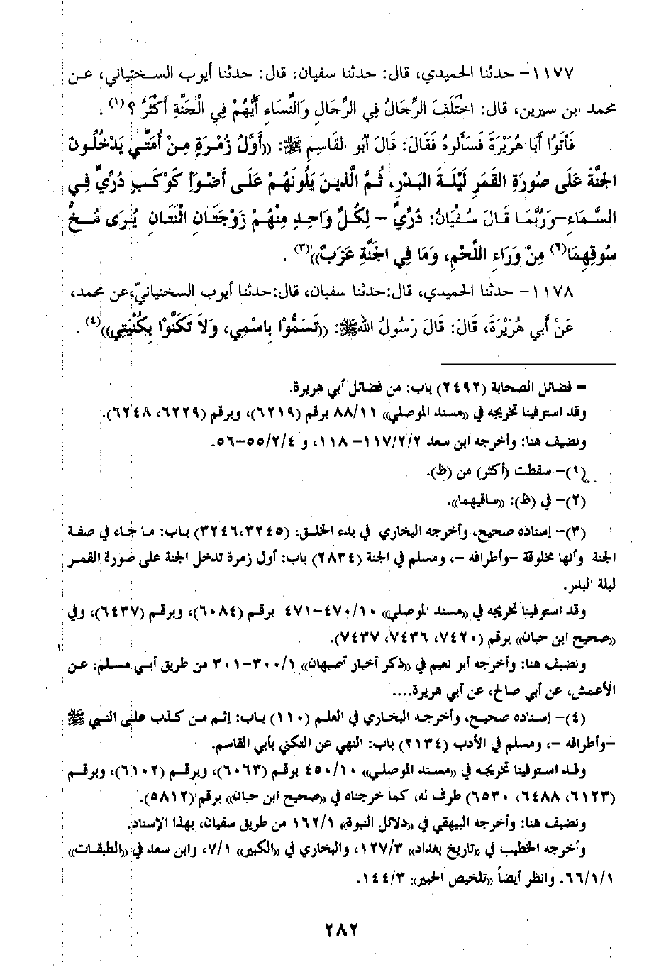 1177 - حَدَّثَنَا الْحُمَيْدِيُّ قَالَ: ثنا سُفْيَانُ، قَالَ: ثنا أَيُّوبُ السِّخْتِيَانِيُّ، عَنْ مُحَمَّدِ بْنِ سِيرِينَ، قَالَ: اخْتَلَفَ الرِّجَالُ فِي الرِّجَالِ، وَالنِّسَاءِ، أَيُّهُمْ فِي الْجَنَّةِ أَكْثَرُ؟ فَأَتَوْا أَبَا هُرَيْرَةَ، فَسَأَلُوهُ، فَقَالَ: قَالَ أَبُو الْقَاسِمِ صَلَّى اللهُ عَلَيْهِ وَسَلَّمَ: " §أَوَّلُ زُمْرَةٍ مِنْ أُمَّتِي يَدْخُلُونَ الْجَنَّةَ عَلَى صُورَةِ الْقَمَرِ لَيْلَةَ الْبَدْرِ، ثُمَّ الَّذِينَ يَلُونَهُمْ عَلَى أَضْوَأِ كَوْكَبٍ دُرِّيٍّ فِي السَّمَاءِ، وَرُبَّمَا قَالَ سُفْيَانُ: دُرِّئٍ لِكُلِّ وَاحِدٍ مِنْهُمْ زَوْجَتَانِ اثْنَتَانِ يُرَى مُخُّ سَاقَيْهُمَا مِنْ وَرَاءِ اللَّحْمِ، وَمَا فِي الْجَنَّةِ عَزَبٌ "