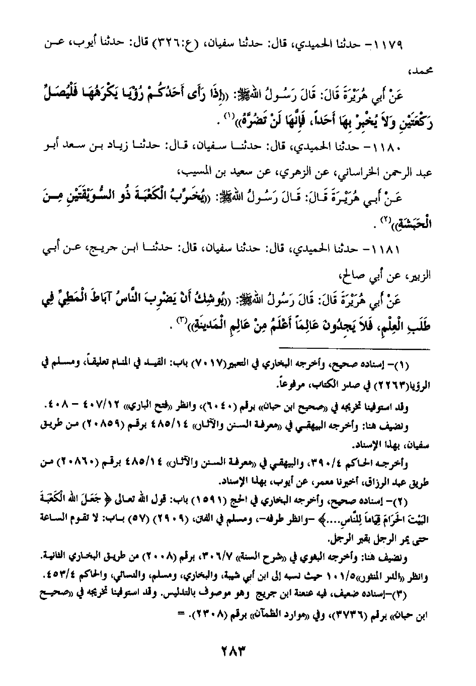 1180 - حَدَّثَنَا الْحُمَيْدِيُّ قَالَ: ثنا سُفْيَانُ، قَالَ: ثنا زِيَادُ بْنُ سَعْدٍ أَبُو عَبْدِ الرَّحْمَنِ الْخُرَاسَانِيُّ، عَنِ الزُّهْرِيِّ، عَنْ سَعِيدِ بْنِ الْمُسَيِّبِ، عَنْ أَبِي هُرَيْرَةَ، قَالَ: قَالَ رَسُولُ اللَّهِ صَلَّى اللهُ عَلَيْهِ وَسَلَّمَ: «§يُخَرِّبُ الْكَعْبَةَ ذُو السُّوَيْقَتَيْنِ مِنَ الْحَبَشَةِ»