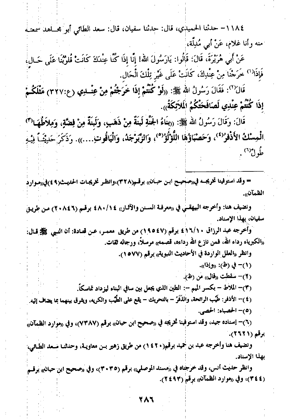 1184 - حَدَّثَنَا الْحُمَيْدِيُّ قَالَ: ثنا سُفْيَانُ، قَالَ: سَعْدٌ الطَّائِيُّ أَبُو مُجَاهِدٍ: سَمِعْتُهُ مِنْهُ وَأَنَا غُلَامٌ، عَنْ أَبِي مُدِلَّةٍ، عَنْ أَبِي هُرَيْرَةَ، قَالَ: يَا رَسُولَ اللَّهِ إِنَّا إِذَا كُنَّا عِنْدَكَ كَانَتْ قُلُوبُنَا عَلَى حَالٍ، فَإِذَا خَرَجْنَا مِنْ عِنْدِكَ كَانَتْ عَلَى غَيْرِ تِلْكَ الْحَالِ، قَالَ: فَقَالَ رَسُولُ اللَّهِ صَلَّى اللهُ عَلَيْهِ وَسَلَّمَ: «§لَوْ كُنْتُمْ إِذَا خَرَجَتُمْ مِنْ عِنْدِي مِثْلَكُمْ إِذَا كُنْتُمْ عِنْدِي، لَصَافَحَتْكُمُ الْمَلَائِكَةُ»