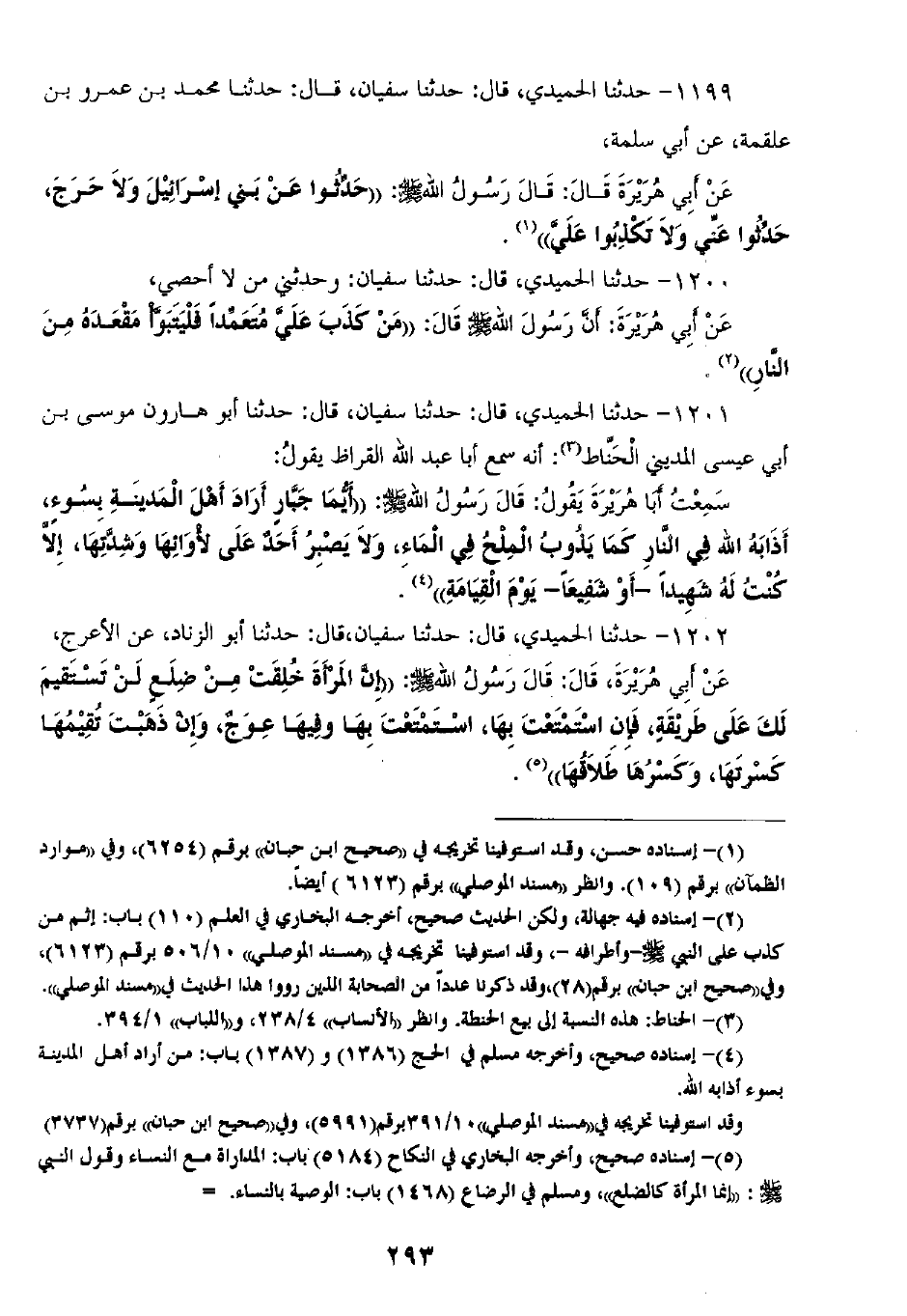 1199 - حَدَّثَنَا الْحُمَيْدِيُّ قَالَ: ثنا سُفْيَانُ، قَالَ: ثنا مُحَمَّدُ بْنُ عَمْرِو بْنِ عَلْقَمَةَ، عَنْ أَبِي سَلَمَةَ، عَنْ أَبِي هُرَيْرَةَ، قَالَ: قَالَ رَسُولُ اللَّهِ صَلَّى اللهُ عَلَيْهِ وَسَلَّمَ: «§حَدِّثُوا عَنْ بَنِي إِسْرَائِيلَ وَلَا حَرَجَ، حَدِّثُوا عَنِّي وَلَا تَكْذِبُوا عَلَيَّ»