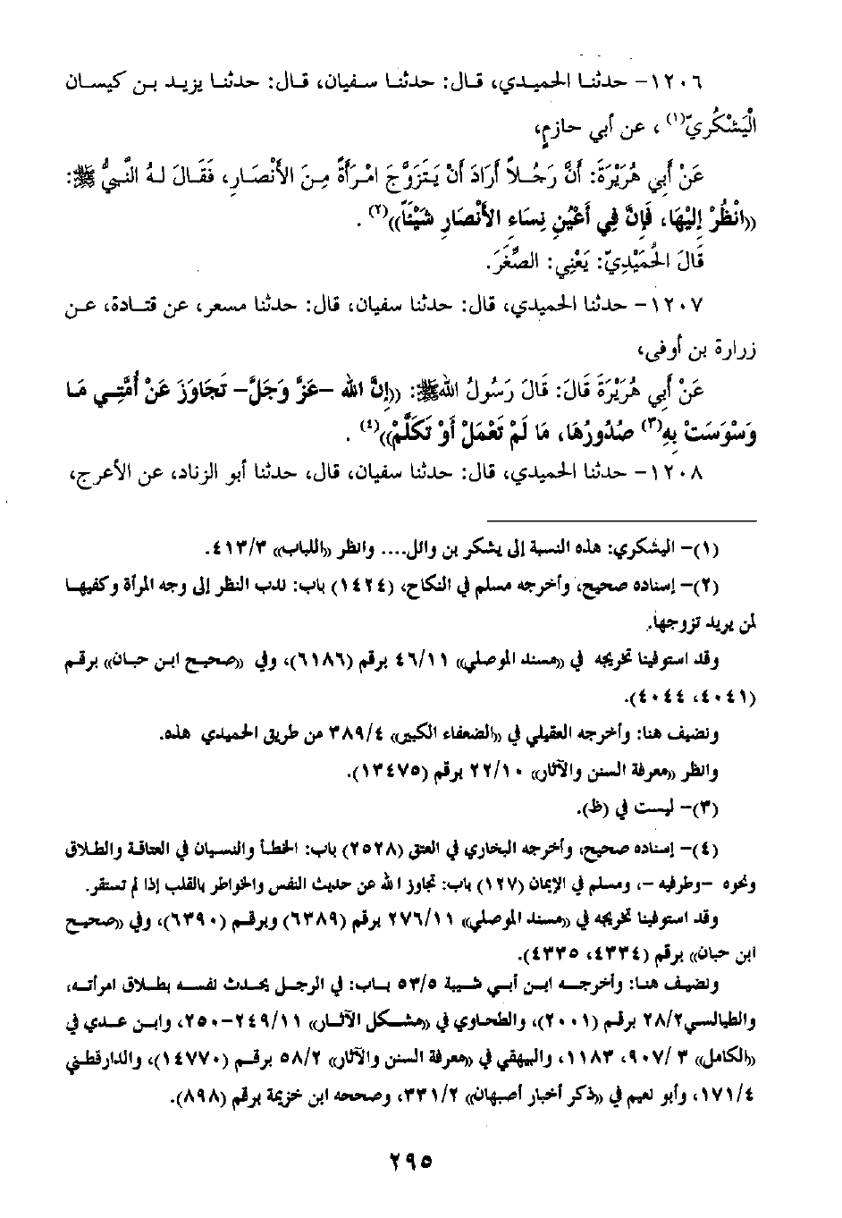 1207 - حَدَّثَنَا الْحُمَيْدِيُّ قَالَ: ثنا سُفْيَانُ، قَالَ: ثنا مِسْعَرُ، عَنْ قَتَادَةَ، عَنْ زُرَارَةَ بْنِ أَوْفَى، عَنْ أَبِي هُرَيْرَةَ، قَالَ: قَالَ رَسُولُ اللَّهِ صَلَّى اللهُ عَلَيْهِ وَسَلَّمَ: «إِنَّ §اللَّهَ عَزَّ وَجَلَّ تَجَاوَزَ عَنْ أُمَّتِي مَا وَسْوَسَتْ فِي صُدُورِهَا، مَا لَمْ تَعْمَلْ، أَوْ تَكَلَّمْ»