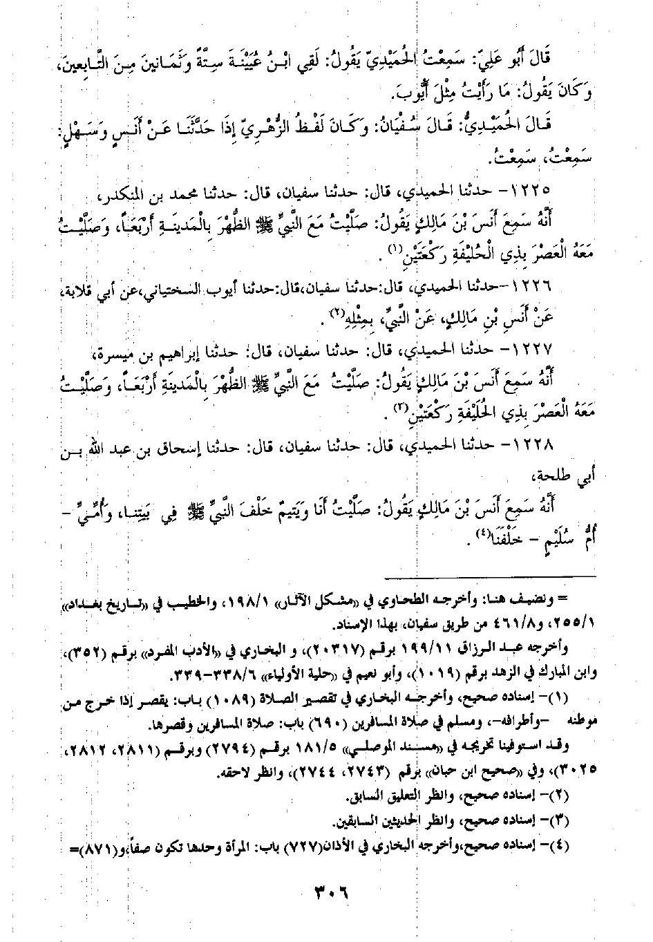 1226 - حَدَّثَنَا الْحُمَيْدِيُّ قَالَ: ثنا سُفْيَانُ، قَالَ: ثنا أَيُّوبُ السِّخْتِيَانِيُّ، عَنْ أَبِي قِلَابَةَ، عَنْ أَنَسِ بْنِ مَالِكٍ، عَنِ النَّبِيِّ صَلَّى اللهُ عَلَيْهِ وَسَلَّمَ، مِثْلَهُ