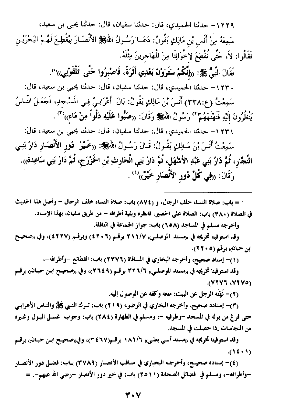 1231 - حَدَّثَنَا الْحُمَيْدِيُّ قَالَ: ثنا سُفْيَانُ، قَالَ: ثنا يَحْيَى بْنُ سَعِيدٍ، قَالَ: سَمِعْتُ أَنَسَ بْنَ مَالِكٍ، يَقُولُ: قَالَ رَسُولُ اللَّهِ صَلَّى اللهُ عَلَيْهِ وَسَلَّمَ: «§خَيْرُ دُورِ الْأَنْصَارِ دَارُ بَنِي النَّجَّارِ، ثُمَّ دَارُ بَنِي عَبْدِ الْأَشْهَلِ، ثُمَّ دَارُ بَنِي الْحَارِثِ بْنِ الْخَزْرَجِ، ثُمَّ دَارُ بَنِي سَاعِدَةَ» ، وَقَالَ: «فِي كُلُّ دُورِ الْأَنْصَارِ خَيْرٌ»