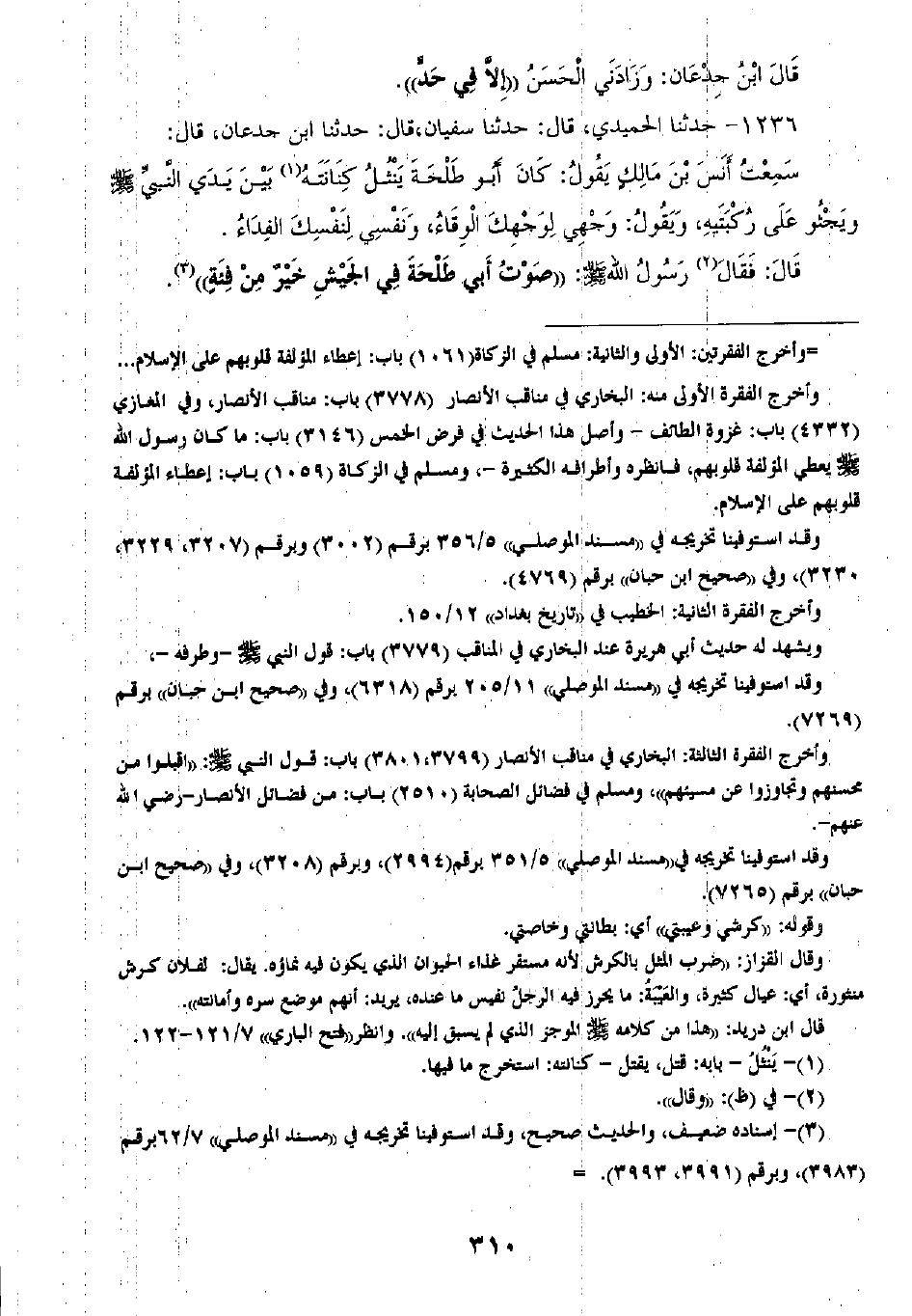 1236 - حَدَّثَنَا الْحُمَيْدِيُّ قَالَ: ثنا سُفْيَانُ، قَالَ: ثنا ابْنُ جُدْعَانَ، قَالَ: سَمِعْتُ أَنَسَ بْنَ مَالِكٍ، يَقُولُ: كَانَ أَبُو طَلْحَةَ يَنْثِلُ كِنَانَتَهُ بَيْنَ يَدَيِ النَّبِيِّ صَلَّى اللهُ عَلَيْهِ وَسَلَّمَ، وَيَجْثُو عَلَى رُكْبَتَيْهِ، وَيَقُولُ: وَجْهِي لِوَجْهِكَ الْوِقَاءُ، وَنَفْسِي لِنَفْسِكَ الْفِدَاءُ، قَالَ: فَقَالَ رَسُولُ اللَّهِ صَلَّى اللهُ عَلَيْهِ وَسَلَّمَ: «§صَوْتُ أَبِي طَلْحَةَ فِي الْجَيْشِ خَيْرٌ مِنْ فِئَةٍ» -[311]- قَالَ أَنَسٌ: «وَرَأَيْتُ ابْنَ أُمِّ مَكْتُومٍ وَمَعَهُ لِوَاءُ الْمُسْلِمِينَ فِي بَعْضِ مَشَاهِدِهِمْ»
