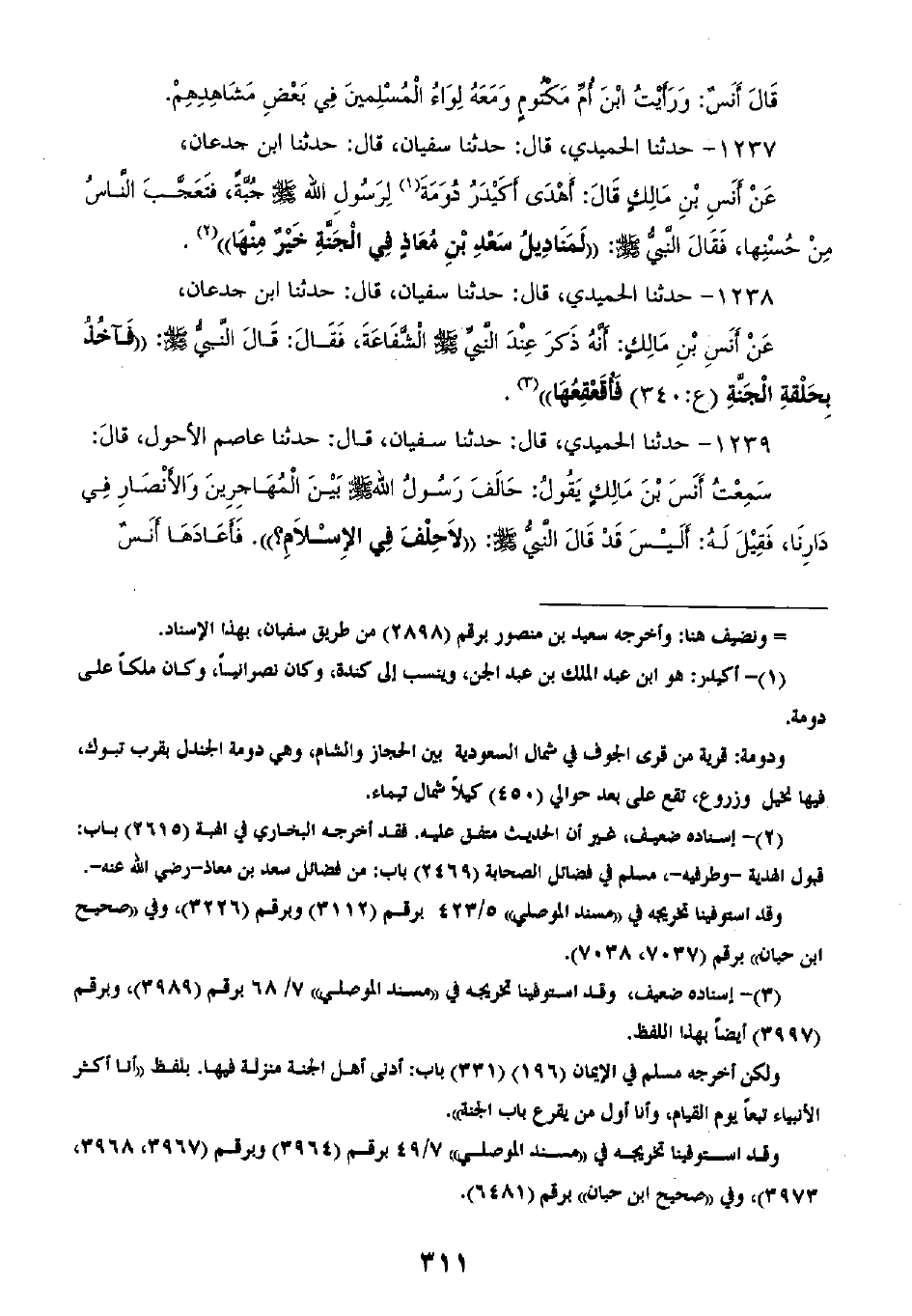 1237 - حَدَّثَنَا الْحُمَيْدِيُّ قَالَ: ثنا سُفْيَانُ، قَالَ: ثنا ابْنُ جُدْعَانَ، عَنْ أَنَسِ بْنِ مَالِكٍ، قَالَ: أَهْدَى أُكَيْدِرُ دَوْمَةِ لِرَسُولِ اللَّهِ صَلَّى اللهُ عَلَيْهِ وَسَلَّمَ جُبَّةً، فَتَعَجَّبَ النَّاسُ مِنْ حُسْنِهَا، فَقَالَ النَّبِيُّ صَلَّى اللهُ عَلَيْهِ وَسَلَّمَ: «§لَمَنَادِيلُ سَعْدِ بْنِ مُعَاذٍ فِي الْجَنَّةِ خَيْرٌ مِنْهَا»