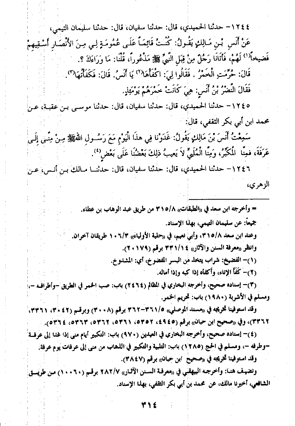 1244 - حَدَّثَنَا الْحُمَيْدِيُّ قَالَ: ثنا سُفْيَانُ، قَالَ: ثنا سُلَيْمَانُ التَّيْمِيُّ، عَنْ أَنَسِ بْنِ مَالِكٍ، يَقُولُ: كُنْتُ قَائِمًا عَلَى عُمُومَةٍ لِي مِنَ الْأَنْصَارِ أَسْقِيهِمْ فَضِيخًا لَهُمْ، فَأَتَانَا رَجُلٌ مِنْ قِبَلِ النَّبِيِّ صَلَّى اللهُ عَلَيْهِ وَسَلَّمَ مَذْعُورًا، قُلْنَا: مَا وَرَاءَكَ؟ قَالَ: «§حُرِّمَتِ الْخَمْرُ» ، فَقَالُوا لِي: أَكْفِهَا يَا أَنَسُ، قَالَ: فَكَفَأْتُهَا فَقَالَ النَّضْرُ بْنُ أَنَسٍ: «هِيَ كَانَتْ خَمْرَهُمْ يَوْمَئِذٍ»