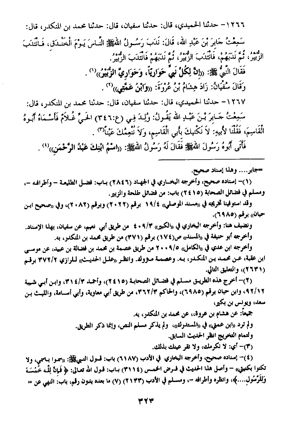 1266 - حَدَّثَنَا الْحُمَيْدِيُّ قَالَ: ثنا سُفْيَانُ، قَالَ: ثنا مُحَمَّدُ بْنُ الْمُنْكَدِرِ، قَالَ: سَمِعْتُ جَابِرَ بْنَ عَبْدِ اللَّهِ، قَالَ: نَدَبَ رَسُولُ اللَّهِ صَلَّى اللهُ عَلَيْهِ وَسَلَّمَ النَّاسَ يَوْمَ الْخَنْدَقِ فَانْتَدَبَ الزُّبَيْرُ، ثُمَّ نَدَبَهُمْ، فَانْتَدَبَ الزُّبَيْرُ، ثُمَّ نَدَبَهُمْ، فَانْتَدَبَ الزُّبَيْرُ، فَقَالَ النَّبِيُّ صَلَّى اللهُ عَلَيْهِ وَسَلَّمَ: «إِنَّ §لِكُلِّ نَبِيٍّ حَوَارِيًّا، وَحَوَارِيَّ الزُّبَيْرُ» وَقَالَ سُفْيَانُ: زَادَ هِشَامُ بْنُ عُرْوَةَ: «وَابْنُ عَمَّتِي»