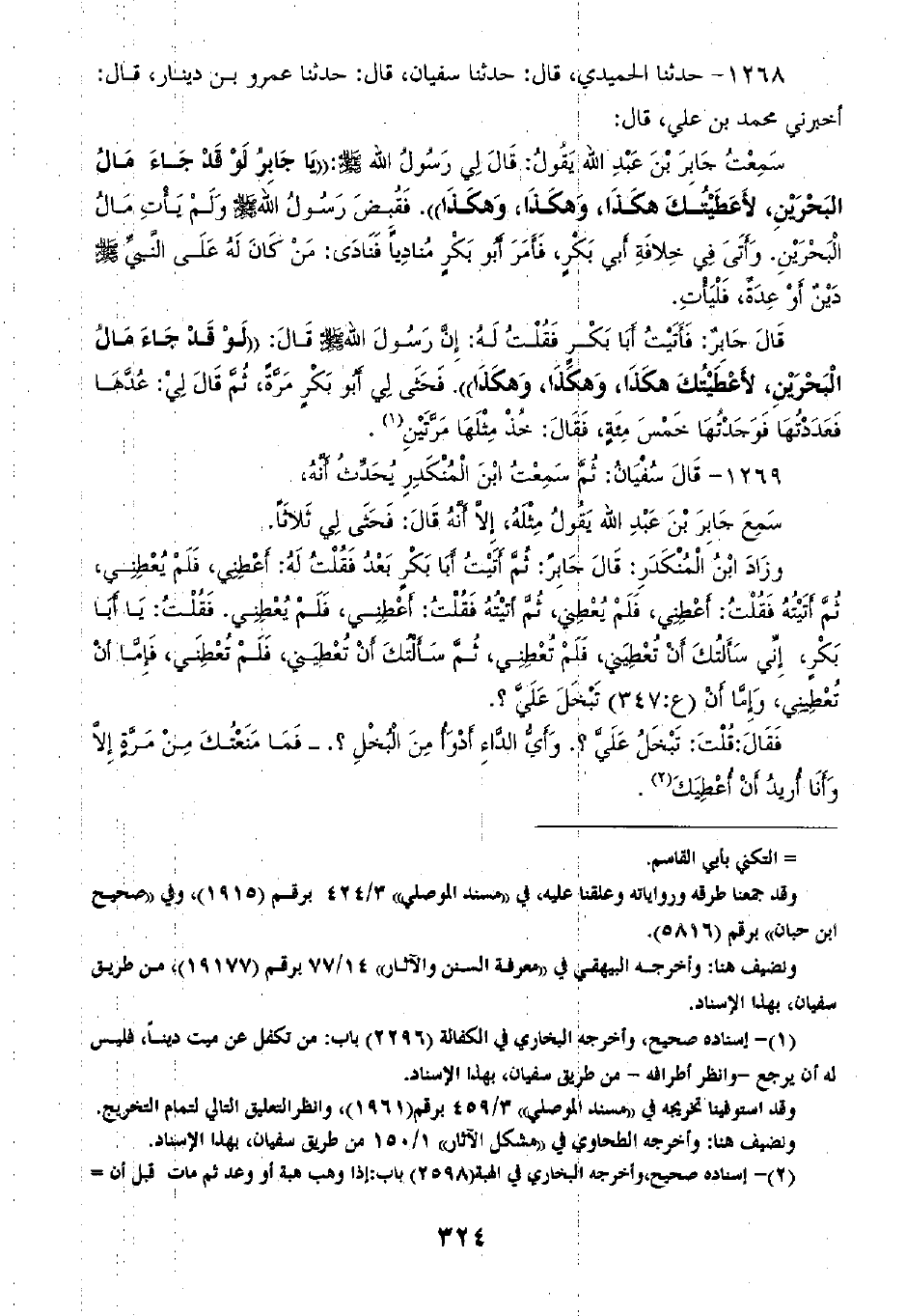 1268 - حَدَّثَنَا الْحُمَيْدِيُّ قَالَ: ثنا سُفْيَانُ، قَالَ: ثنا عَمْرُو بْنُ دِينَارٍ، قَالَ: أَخْبَرَنِي مُحَمَّدُ بْنُ عَلِيٍّ، قَالَ: سَمِعْتُ جَابِرَ بْنَ عَبْدِ اللَّهِ، يَقُولُ: قَالَ لِي رَسُولُ اللَّهِ صَلَّى اللهُ عَلَيْهِ وَسَلَّمَ: «§يَا جَابِرُ لَوْ قَدْ جَاءَ مَالُ الْبَحْرَيْنِ لَأَعْطَيْتُكَ هَكَذَا، وَهَكَذَا، وَهَكَذَا» ، فَقُبِضَ رَسُولُ اللَّهِ صَلَّى اللهُ عَلَيْهِ وَسَلَّمَ وَلَمْ يَأْتِ مَالُ الْبَحْرَيْنِ، وَأَتَى فِي خِلَافَةِ أَبِي بَكْرٍ، فَأَمَرَ أَبُو بَكْرٍ مُنَادِيًا فَنَادَى مَنْ كَانَ لَهُ عَلَى النَّبِيِّ صَلَّى اللهُ عَلَيْهِ وَسَلَّمَ دَيْنٌ أَوْ عِدَةٌ فَلْيَأْتِ، قَالَ جَابِرٌ: فَأَتَيْتُ أَبَا بَكْرٍ، فَقُلْتُ لَهُ: إِنَّ رَسُولَ اللَّهِ صَلَّى اللهُ عَلَيْهِ وَسَلَّمَ، قَالَ: «لَوْ قَدْ جَاءَ مَالُ الْبَحْرَيْنِ لَأَعْطَيْتُكَ هَكَذَا، وَهَكَذَا، وَهَكَذَا» فَحَثَى لِي أَبُو بَكْرٍ مَرَّةً، ثُمَّ قَالَ لِي: عُدَّهَا، فَعَدَدْتُهَا فَوَجَدْتُهَا خَمْسَمِائَةٍ، فَقَالَ خُذْ مِثْلَهَا مَرَّتَيْنِ