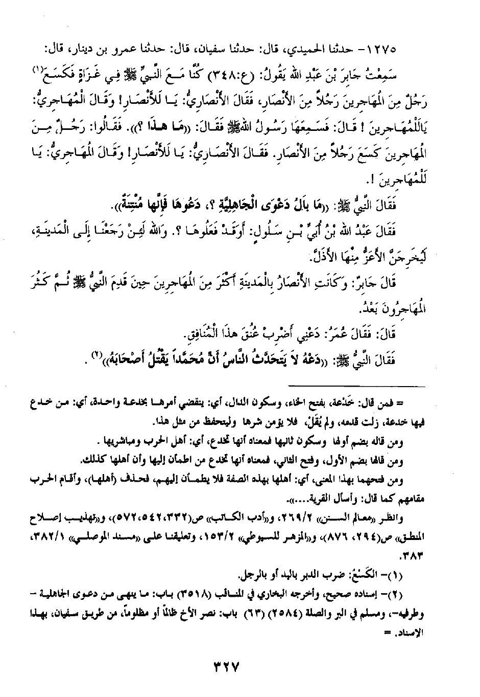 1275 - حَدَّثَنَا الْحُمَيْدِيُّ قَالَ: ثنا سُفْيَانُ، قَالَ: ثنا عَمْرُو بْنُ دِينَارٍ، قَالَ: سَمِعْتُ جَابِرَ بْنَ عَبْدِ اللَّهِ، يَقُولُ: كُنَّا مَعَ النَّبِيِّ صَلَّى اللهُ عَلَيْهِ وَسَلَّمَ فِي غَزَاةٍ فَكَسَعَ رَجُلٌ مِنَ الْمُهَاجِرِينَ رَجُلًا مِنَ الْأَنْصَارِ، فَقَالَ الْأَنْصَارِيُّ: يَا لَلْأَنْصَارِ، وَقَالَ الْمُهَاجِرِيُّ: يَا لَلْمُهَاجِرِينَ، قَالَ: فَسَمِعَهَا رَسُولُ اللَّهِ صَلَّى اللهُ عَلَيْهِ وَسَلَّمَ، فَقَالَ: «مَا هَذَا؟» ، فَقَالُوا: رَجُلٌ مِنَ الْمُهَاجِرِينَ كَسَعَ رَجُلًا مِنَ الْأَنْصَارِ، فَقَالَ الْأَنْصَارِيُّ: يَا لَلْأَنْصَارِ، وَقَالَ الْمُهَاجِرِيُّ: يَا لَلْمُهَاجِرِينَ، فَقَالَ النَّبِيُّ صَلَّى اللهُ عَلَيْهِ وَسَلَّمَ: «§مَا بَالُ دَعْوَى الْجَاهِلِيَّةٍ دَعُوهَا، فَإِنَّهَا مُنْتِنَةٌ» ، فَقَالَ عَبْدُ اللَّهِ بْنُ أَبِيِّ ابْنِ سَلُولَ: أَوَقَدْ فَعَلُوهَا؟، وَاللَّهِ لَإِنْ رَجَعْنَا إِلَى الْمَدِينَةِ لَيُخْرِجَنَّ الْأَعَزُّ مِنْهَا الْأَذَلَّ، قَالَ جَابِرٌ: وَكَانَتِ الْأَنْصَارُ بِالْمَدِينَةِ أَكْثَرَ مِنَ الْمُهَاجِرِينَ، حِينَ قَدِمَ النَّبِيُّ صَلَّى اللهُ عَلَيْهِ وَسَلَّمَ، ثُمَّ كَثُرَ الْمُهَاجِرُونَ بَعْدُ، قَالَ: فَقَالَ عُمَرُ: دَعْنِي أَضْرِبْ عُنُقَ هَذَا الْمُنَافِقِ، فَقَالَ النَّبِيُّ صَلَّى اللهُ عَلَيْهِ وَسَلَّمَ: «دَعْهُ لَا يَتَحَدَّثُ النَّاسُ أَنَّ مُحَمَّدًا يَقْتُلُ أَصْحَابَهُ»