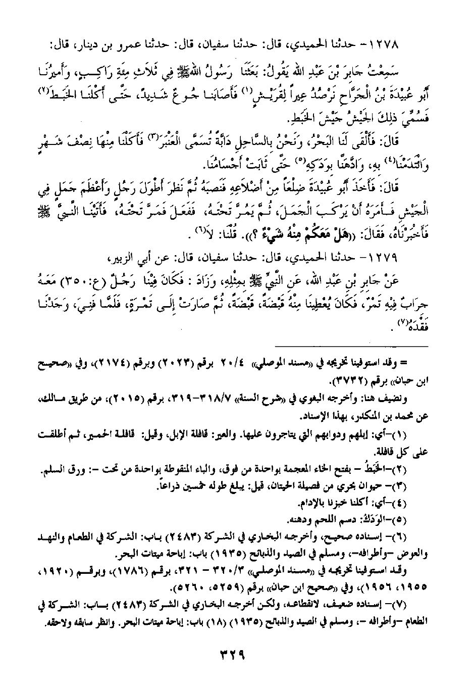 1278 - حَدَّثَنَا الْحُمَيْدِيُّ قَالَ: ثنا سُفْيَانُ، قَالَ: ثنا عَمْرُو بْنُ دِينَارٍ، قَالَ: سَمِعْتُ جَابِرَ بْنَ عَبْدِ اللَّهِ، يَقُولُ: بَعَثَنَا رَسُولُ اللَّهِ صَلَّى اللهُ عَلَيْهِ وَسَلَّمَ فِي ثَلَاثِ مِائَةِ رَاكِبٍ وَأَمِيرُنَا أَبُو عُبَيْدَةَ بْنُ الْجَرَّاحِ نَرْصُدُ عِيرًا لِقُرَيْشٍ، فَأَصَابَنَا جُوعٌ شَدِيدٌ حَتَّى أَكَلْنَا الْخَبَطَ، فَسُمِّيَ ذَلِكَ الْجَيْشُ جَيْشَ الْخَبَطِ، قَالَ: فَأَلْقَى لَنَا الْبَحْرُ وَنَحْنُ بِالسَّاحِلِ دَابَّةً تُسَمَّى الْعَنْبَرَ، فَأَكَلْنَا مِنْهَا نِصْفَ شَهْرٍ، وَايْتَدَمْنَا بِهِ وَادَّهَنَّا بَوَدِكِهِ حَتَّى ثَابَتْ أَجْسَامُنَا، قَالَ: فَأَخَذَ أَبُو عُبَيْدَةَ ضِلَعًا مِنْ أَضْلَاعِهِ فَنَصَبَهُ، ثُمَّ نَظَرَ أَطْوَلَ رَجُلٍ وَأَعْظَمَ جَمَلٍ فِي الْجَيْشٍ، فَأَمَرَهُ أَنْ يَرْكَبَ الْجَمَلَ، ثَمَّ يَمُرَّ تَحْتَهُ، فَفَعَلَ، فَمَرَّ تَحْتَهُ، فَأَتَيْنَا النَّبِيَّ صَلَّى اللهُ عَلَيْهِ وَسَلَّمَ، فَأَخْبَرْنَاهُ، فَقَالَ: «§هَلْ مَعَكُمْ مِنْهُ شَيْءٌ؟» ، قُلْنَا: لَا
