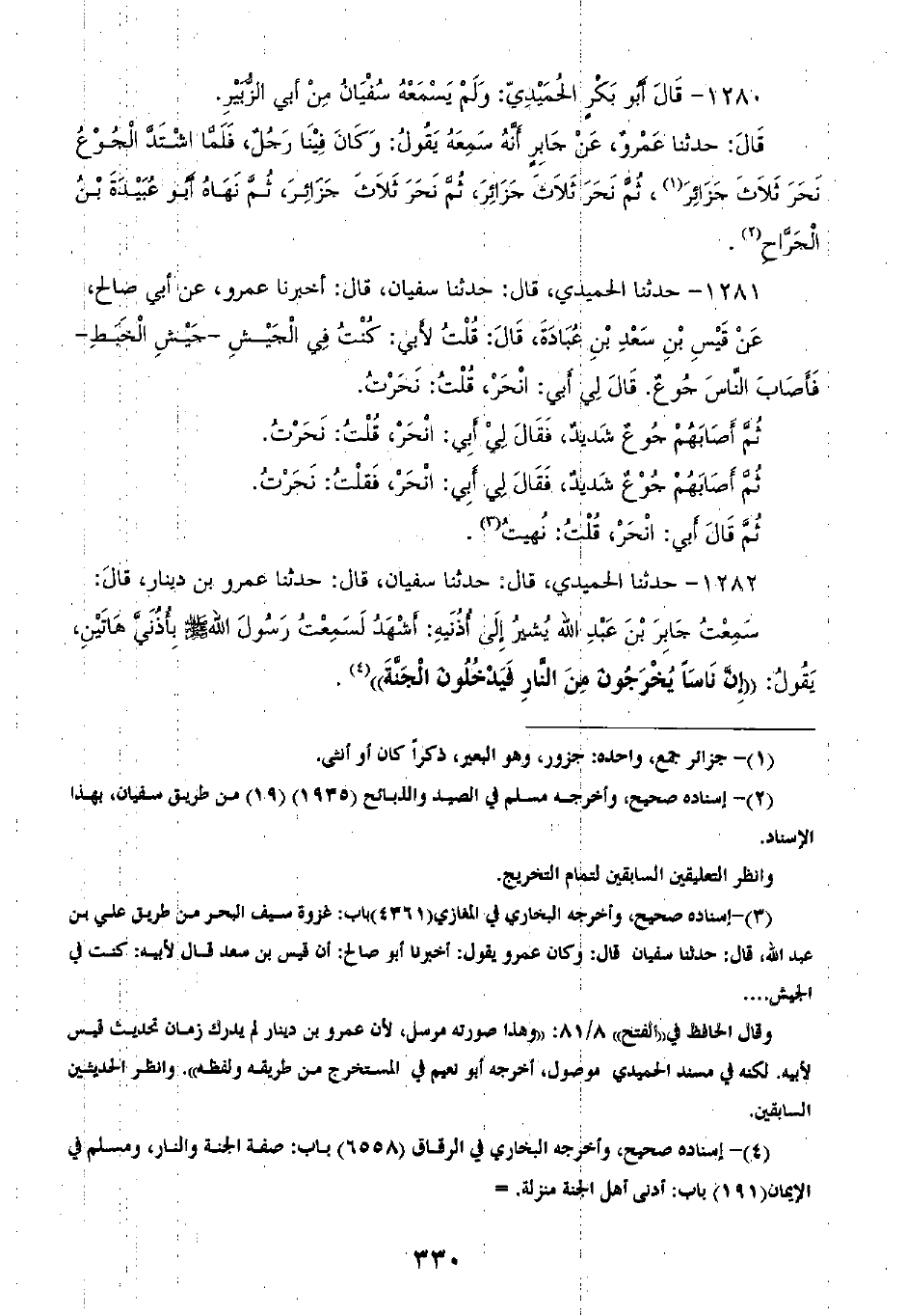 1282 - حَدَّثَنَا الْحُمَيْدِيُّ قَالَ: ثنا سُفْيَانُ، قَالَ: ثنا عَمْرُو بْنُ دِينَارٍ، قَالَ: سَمِعْتُ جَابِرَ بْنِ عَبْدِ اللَّهِ يُشِيرُ إِلَى أُذُنَيْهِ، أَشْهَدُ لَسَمِعْتُ رَسُولَ اللَّهِ صَلَّى اللهُ عَلَيْهِ وَسَلَّمَ بِأُذُنَيَّ هَاتَيْنِ، يَقُولُ: «إِنَّ §نَاسًا يَخْرُجُونَ مِنَ النَّارِ فَيَدْخُلُونَ الْجَنَّةَ»