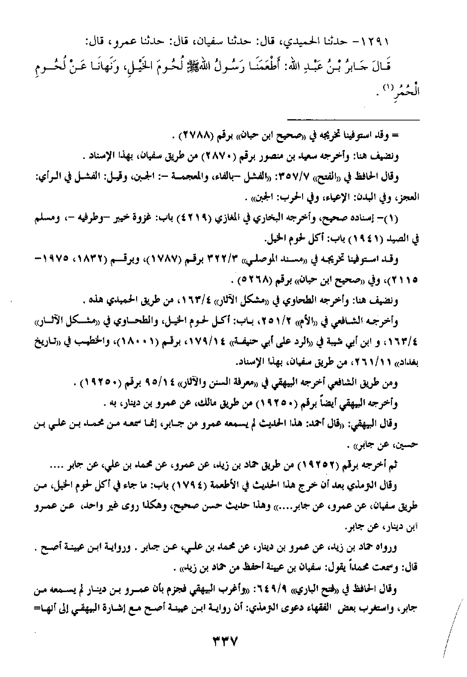 1291 - حَدَّثَنَا الْحُمَيْدِيُّ قَالَ: ثنا سُفْيَانُ، قَالَ: ثنا عَمْرٌو، قَالَ: قَالَ جَابِرُ بْنُ عَبْدِ اللَّهِ: «§أَطْعَمَنَا رَسُولُ اللَّهِ صَلَّى اللهُ عَلَيْهِ وَسَلَّمَ لُحُومَ الْخَيْلِ، وَنَهَانَا عَنْ لُحُومِ الْحُمُرِ»