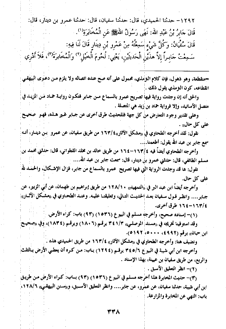 1292 - حَدَّثَنَا الْحُمَيْدِيُّ قَالَ: ثنا سُفْيَانُ، قَالَ: ثنا عَمْرُو بْنُ دِينَارٍ، قَالَ: قَالَ جَابِرُ بْنُ عَبْدِ اللَّهِ: «§نَهَى رَسُولُ اللَّهِ صَلَّى اللهُ عَلَيْهِ وَسَلَّمَ عَنِ الْمُخَابَرَةِ» قَالَ سُفْيَانُ: " وَكُلُّ شَيْءٍ سَمِعْتُهُ مِنْ عَمْرِو بْنِ دِينَارٍ، قَالَ لَنَا فِيهِ سَمِعْتُ جَابِرًا إِلَّا هَذَيْنِ الْحَدِيثَيْنِ، يَعْنِي لُحُومَ الْخَيْلِ وَالْمُخَابَرَةَ، فَلَا أَدْرِي -[339]- بَيْنَهُ وَبَيْنَ جَابِرٍ فِيهِمَا أَحَدٌ أَمْ لَا، وَأَمَّا حَدِيثُ الْأَسْهُمِ فَإِنِّي أَنَا قُلْتُ لَهُ: سَمِعْتَ جَابِرًا عَلَى مَا حَدَّثْتُكُمْ "