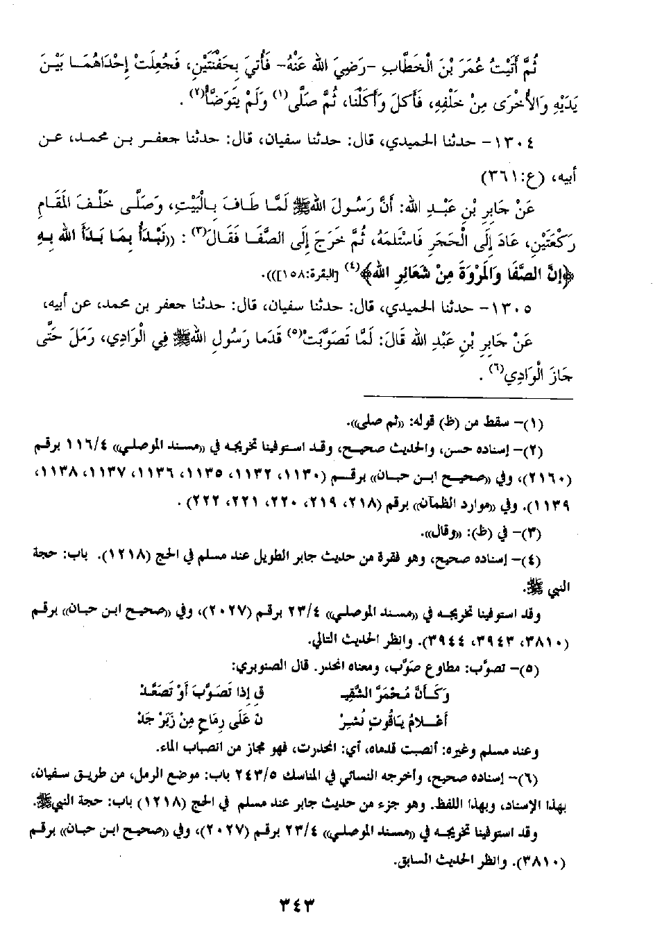 1305 - حَدَّثَنَا الْحُمَيْدِيُّ قَالَ: ثنا سُفْيَانُ، قَالَ: ثنا جَعْفَرُ بْنُ مُحَمَّدٍ، عَنْ أَبِيهِ، عَنْ جَابِرِ بْنِ عَبْدِ اللَّهِ، قَالَ: «§لَمَّا تَصَوَّبَتْ قَدَمَا رَسُولِ اللَّهِ صَلَّى اللهُ عَلَيْهِ وَسَلَّمَ فِي الْوَادِي رَمَلَ حَتَّى جَازَ الْوَادِيَ»