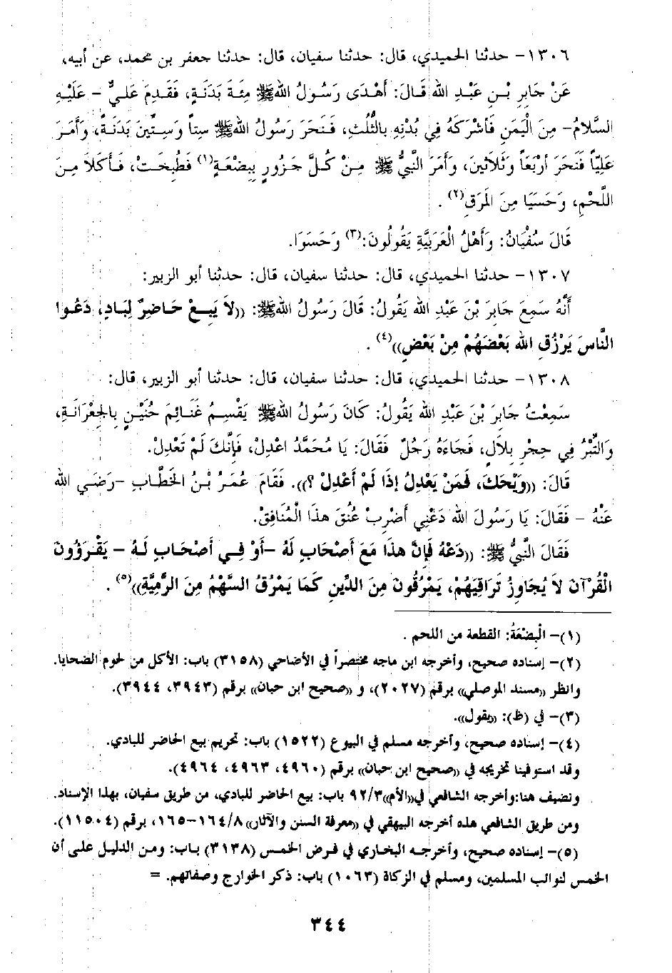 1306 - حَدَّثَنَا الْحُمَيْدِيُّ قَالَ: ثنا سُفْيَانُ، قَالَ: ثنا جَعْفَرُ بْنُ مُحَمَّدٍ، عَنْ أَبِيهِ، عَنْ جَابِرِ بْنِ عَبْدِ اللَّهِ، قَالَ: «أَهْدَى رَسُولُ اللَّهِ صَلَّى اللهُ عَلَيْهِ وَسَلَّمَ مِائَةَ بَدَنَةٍ، فَقَدِمَ عَلِيٌّ مِنَ الْيَمَنِ فَأَشْرَكَهُ فِي بُدْنِهِ، بِالثُّلُثِ، §فَنَحَرَ رَسُولُ اللَّهِ صَلَّى اللهُ عَلَيْهِ وَسَلَّمَ سِتًّا وَسِتِّينَ بَدَنَةً، وَأَمَرَ عَلِيًّا فَنَحَرَ أَرْبَعًا وَثَلَاثِينَ، وَأَمَرَ النَّبِيُّ صَلَّى اللهُ عَلَيْهِ وَسَلَّمَ مِنْ كُلِّ جَزُورٍ بِبِضْعَةٍ، فَطُبِخَتْ، فَأَكَلَا مِنَ اللَّحْمِ وَحَسَيَا مِنَ الْمَرَقِ» ، قَالَ سُفْيَانُ: " وَأَهْلُ الْعَرَبِيَّةِ يَقُولُونَ: وَحَسَوَا "