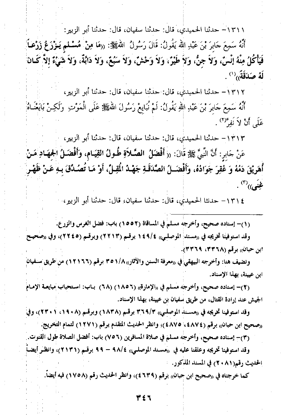 1313 - حَدَّثَنَا الْحُمَيْدِيُّ قَالَ: ثنا سُفْيَانُ، قَالَ: ثنا أَبُو الزُّبَيْرِ، عَنْ جَابِرٍ، أَنَّ النَّبِيَّ صَلَّى اللهُ عَلَيْهِ وَسَلَّمَ، قَالَ: " §أَفْضَلُ الصَّلَاةِ: طُولُ الْقِيَامِ، وَأَفْضَلُ الْجِهَادِ: مَنْ أُهْرِيقَ دَمُهُ، وَعُقِرَ جَوَادُهُ، وَأَفْضَلُ الصَّدَقَةِ: جُهْدُ الْمُقِلِّ، وَمَا تَصَدَّقُ بِهِ عَنْ ظَهْرِ غِنًى "