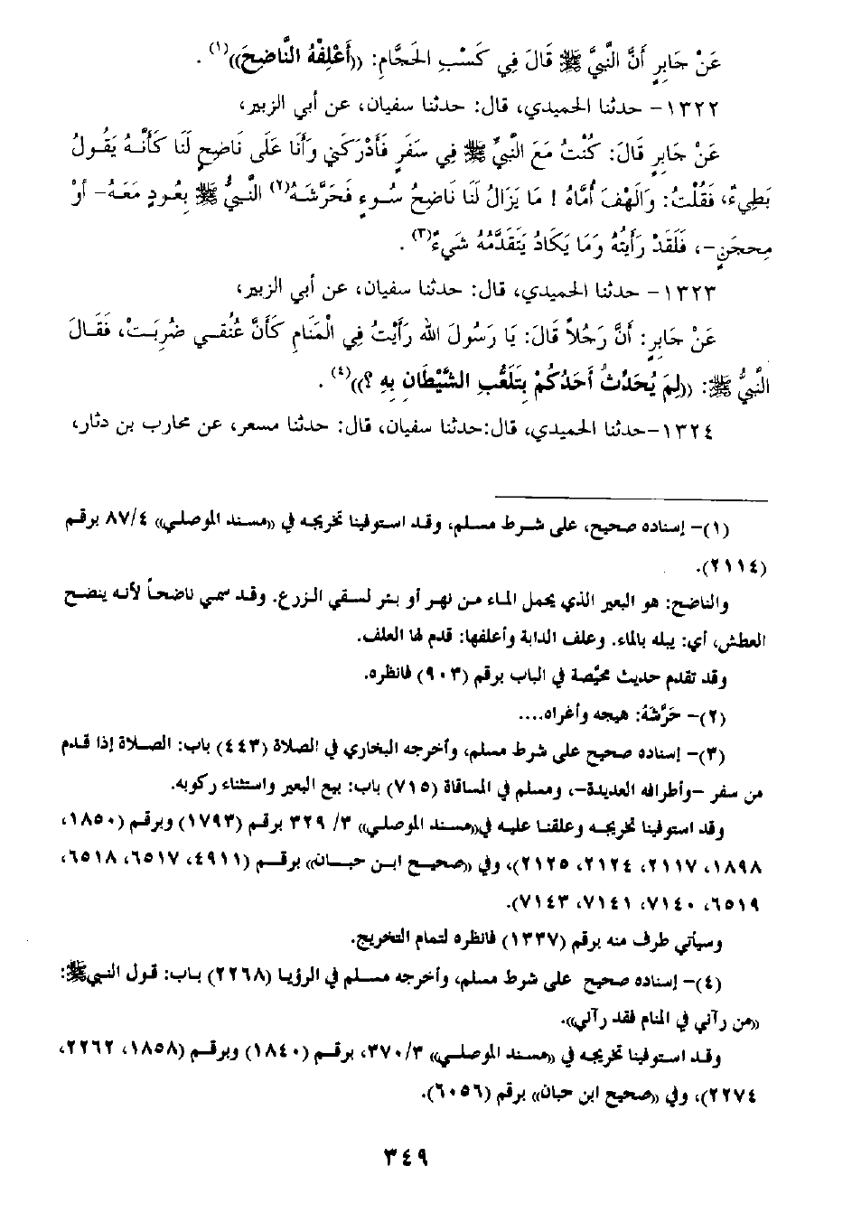 1322 - حَدَّثَنَا الْحُمَيْدِيُّ قَالَ: ثنا سُفْيَانُ، عَنْ أَبِي الزُّبَيْرِ، عَنْ جَابِرٍ، قَالَ: كُنْتُ مَعَ النَّبِيِّ صَلَّى اللهُ عَلَيْهِ وَسَلَّمَ فِي سَفَرٍ فَأَدْرَكَنِي، وَأَنَا عَلَى نَاضِحٍ لَنَا كَأَنَّهُ يَقُولُ: بَطِيءٌ، فَقُلْتُ: وَالَهْفَ أُمَّاهُ، مَا يَزَالُ لَنَا نَاضِحُ سُوءٍ، «§فَحَرَسَهُ النَّبِيُّ صَلَّى اللهُ عَلَيْهِ وَسَلَّمَ بِعُودٍ مَعَهُ، أَوْ مِحْجَنٍ فَلَقَدْ رَأَيْتُهُ، وَمَا يَكَادُ يَتَقَدَّمُهُ شَيْءٌ»