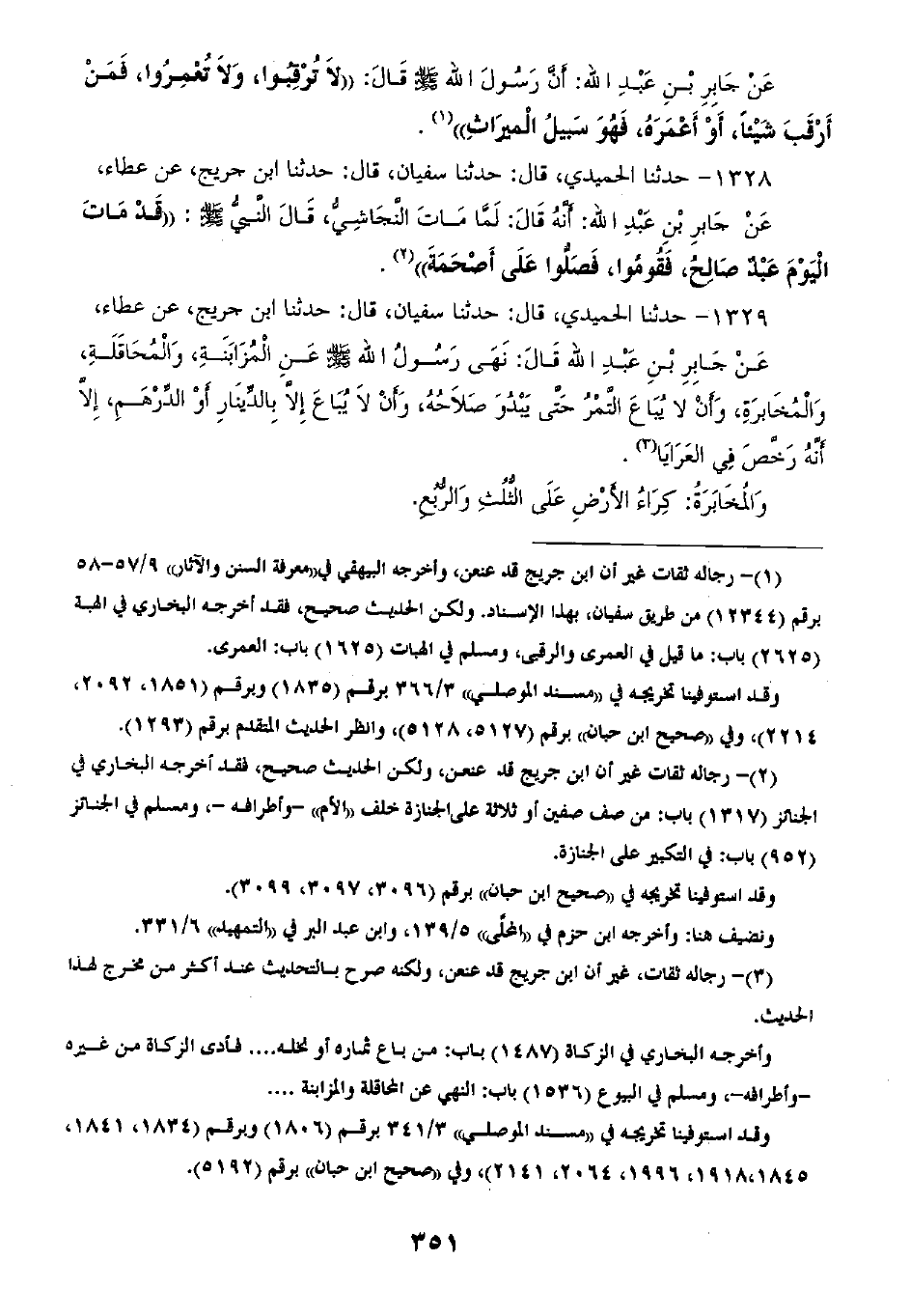 1329 - حَدَّثَنَا الْحُمَيْدِيُّ قَالَ: ثنا سُفْيَانُ، قَالَ: ثنا ابْنُ جُرَيْجٍ، عَنْ عَطَاءٍ، عَنْ جَابِرِ بْنِ عَبْدِ اللَّهِ، قَالَ: «§نَهَى رَسُولُ اللَّهِ صَلَّى اللهُ عَلَيْهِ وَسَلَّمَ عَنِ الْمُزَابَنَةِ، وَالْمُحَاقَلَةِ، وَالْمُخَابَرَةِ، وَأَنْ لَا يُبَاعَ التَّمْرُ حَتَّى يَبْدُوَ صَلَاحُهُ، وَأَنْ لَا يُبَاعَ إِلَّا بِالدِّينَارِ، أَوِ الدِّرْهَمِ، إِلَّا أَنَّهُ رَخَّصَ فِي الْعَرَايَا» وَالْمُخَابَرَةِ: كَرْيُ الْأَرْضِ عَلَى الثُّلُثِ وَالرُّبْعِ -[352]-، وَالْمُحَاقَلَةُ: بَيْعُ السُّنْبُلِ بِالْحِنْطَةِ، وَالْمُزَابَنَةُ: بَيْعُ الثَّمَرِ بِالتَّمْرِ "