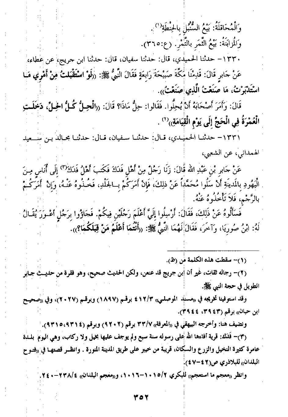 1330 - حَدَّثَنَا الْحُمَيْدِيُّ قَالَ: ثنا سُفْيَانُ، قَالَ: ثنا ابْنُ جُرَيْجٍ، عَنْ عَطَاءٍ، عَنْ جَابِرٍ، قَالَ: قَدِمْنَا مَكَّةَ صَبِيحَةَ رَابِعَةٍ، فَقَالَ النَّبِيُّ صَلَّى اللهُ عَلَيْهِ وَسَلَّمَ: «§لَوِ اسْتَقْبَلْتُ مِنْ أَمْرِي مَا اسْتَدْبَرْتُ، مَا صَنَعْتُ الَّذِي صَنَعْتُ» ، قَالَ: «وَأَمَرَ أَصْحَابَهُ أَنْ يُحِلُّوا» ، فَقَالُوا: حِلُّ مَاذَا؟ قَالَ: «الْحِلُّ كُلُّ الْحِلِّ، دَخَلَتِ الْعُمْرَةُ فِي الْحَجِّ إِلَى يَوْمِ الْقِيَامَةِ»