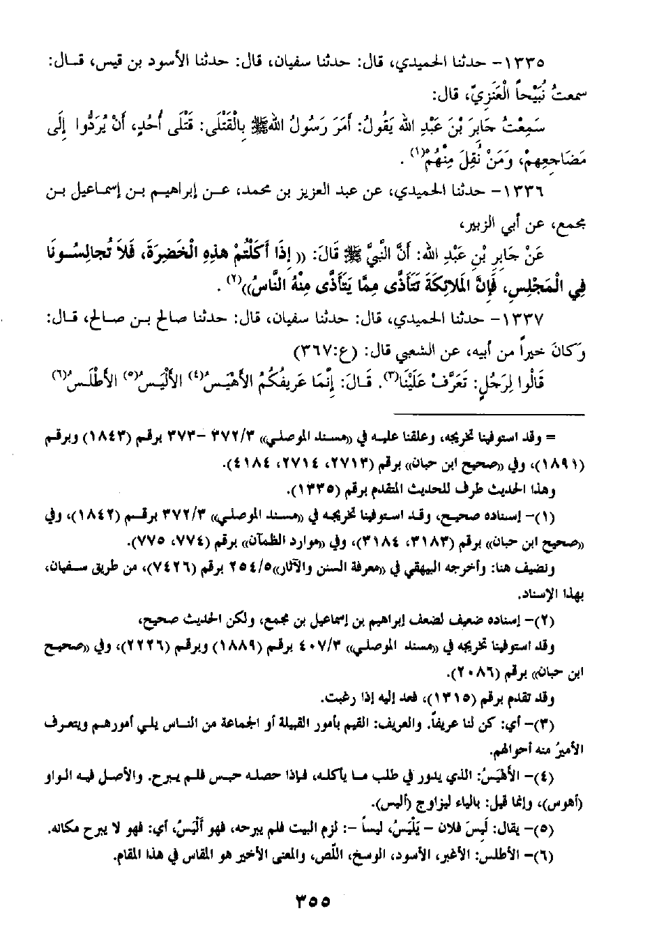 1336 - حَدَّثَنَا بِشْرُ بْنُ مُوسَى قَالَ: ثنا الْحُمَيْدِيُّ، عَنْ عَبْدِ الْعَزِيزِ بْنِ مُحَمَّدٍ، عَنْ إِبْرَاهِيمَ بْنِ إِسْمَاعِيلَ بْنِ مُجَمِّعٍ، عَنْ أَبِي الزُّبَيْرِ، عَنْ جَابِرِ بْنِ عَبْدِ اللَّهِ أَنَّ النَّبِيَّ صَلَّى اللهُ عَلَيْهِ وَسَلَّمَ، قَالَ: «§إِذَا أَكَلْتُمْ هَذِهِ الْخَضِرَةَ، فَلَا تُجَالِسُونَا فِي الْمَجْلِسِ، فَإِنَّ الْمَلَائِكَةَ تَتَأَذَّى مِمَّا يَتَأَذَّى مِنْهُ النَّاسُ»