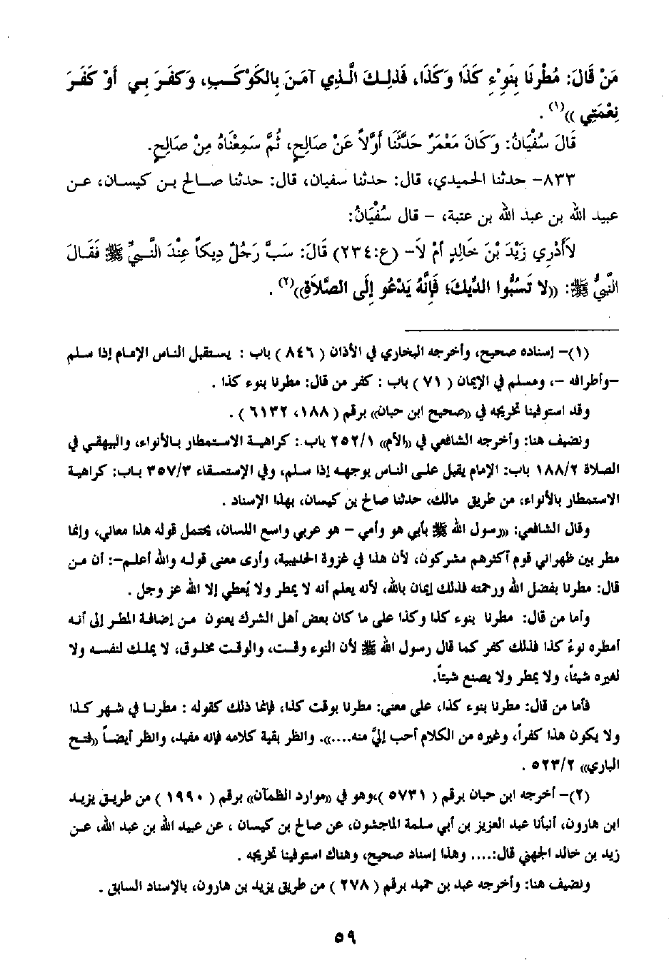 833 - حَدَّثَنَا الْحُمَيْدِيُّ قَالَ: ثنا سُفْيَانُ، قَالَ: ثنا صَالِحُ بْنُ كَيْسَانَ، عَنْ عُبَيْدِ اللَّهِ بْنِ عَبْدِ اللَّهِ بْنِ عُتْبَةَ، قَالَ سُفْيَانُ: لَا أَدْرِي زِيدُ بْنُ خَالِدٍ أَمْ لَا، قَالَ: سَبَّ رَجُلٌ دِيكًا عِنْدَ النَّبِيِّ صَلَّى اللهُ عَلَيْهِ وَسَلَّمَ، فَقَالَ النَّبِيُّ صَلَّى اللهُ عَلَيْهِ وَسَلَّمَ: «§لَا تَسُبُّوا الدِّيكَ، فَإِنَّهُ يَدْعُو إِلَى الصَّلَاةِ»