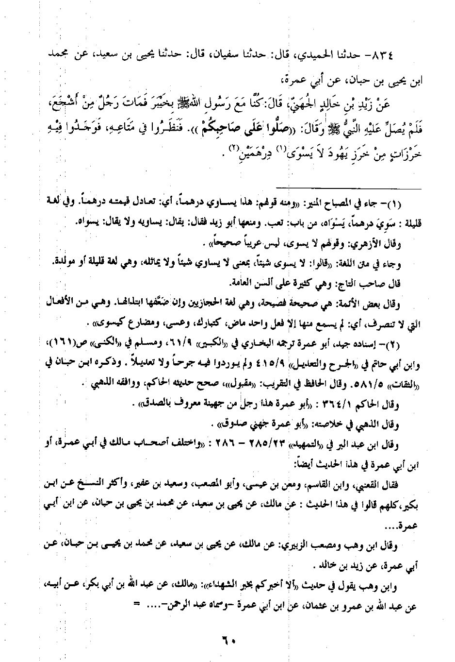 834 - حَدَّثَنَا الْحُمَيْدِيُّ قَالَ: ثنا سُفْيَانُ، قَالَ: ثنا يَحْيَى بْنُ سَعِيدٍ، عَنْ مُحَمَّدِ بْنِ يَحْيَى بْنِ حَبَّانَ، عَنْ أَبِي عَمْرَةَ، عَنْ زَيْدِ بْنِ خَالِدٍ الْجُهَنِيِّ، قَالَ: كُنَّا مَعَ رَسُولِ اللَّهِ صَلَّى اللهُ عَلَيْهِ وَسَلَّمَ بِخَيْبَرَ، فَمَاتَ رَجُلٌ مِنْ أَشْجَعَ، فَلَمْ يُصَلِّ عَلَيْهِ النَّبِيُّ صَلَّى اللهُ عَلَيْهِ وَسَلَّمَ، وَقَالَ: «§صَلُّوا عَلَى صَاحِبِكُمْ» ، فَنَظَرُوا فِي مَتَاعِهِ، فَوَجَدُوا فِيهِ خَرَزَاتٍ مِنْ خَرَزِ يَهُودَ، لَا يَسْوَى دِرْهَمَيْنِ
