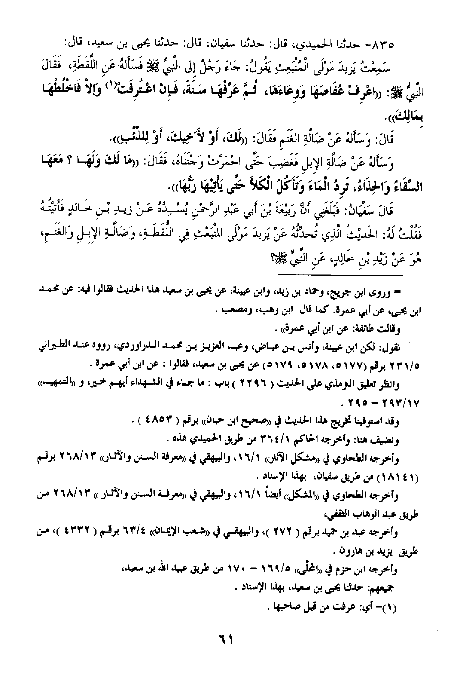 835 - حَدَّثَنَا الْحُمَيْدِيُّ قَالَ: ثنا سُفْيَانُ، قَالَ: ثنا يَحْيَى بْنُ سَعِيدٍ، قَالَ: سَمِعْتُ يَزِيدَ مَوْلَى الْمُنْبَعِثِ، يَقُولُ: جَاءَ رَجُلٌ إِلَى النَّبِيِّ صَلَّى اللهُ عَلَيْهِ وَسَلَّمَ فَسَأَلَهُ عَنِ §اللُّقَطَةِ، فَقَالَ النَّبِيُّ صَلَّى اللهُ عَلَيْهِ وَسَلَّمَ: «أَعْرِفْ عُفَاصَهَا وَوِعَاءَهَا ثُمَّ عَرِّفْهَا سَنَةً، فَإِنِ اعْتُرِفَتْ وَإِلَا فَاخْلِطْهَا بِمَالِكَ» قَالَ: وَسَأَلهُ عَنْ ضَالَّةِ الْغَنَمِ، فَقَالَ: «لَكَ أَوْ لِأَخِيكَ أَوْ لِلذِّئْبِ» وَسَأَلَهُ عَنْ ضَالَّةِ الْإِبِلِ، فَغَضِبَ حَتَّى احْمَرَّتْ وَجْنَتَاهُ، فَقَالَ: «مَا لَكَ وَلَهَا؟ مَعَهَا السِّقَاءُ وَالْحِذَاءُ، تَرِدُ الْمَاءَ وَتَأَكُلُ الْكَلَأَ، حَتَّى يَأْتِيَهَا رَبُّهَا» قَالَ سُفْيَانُ: " فَبَلَغَنِي أَنَّ رَبِيعَةَ بْنَ أَبِي عَبْدِ الرَّحْمَنِ يُسْنِدُهُ، عَنْ زَيْدِ بْنِ خَالِدٍ، فَأَتَيْتُهُ، فَقُلْتُ لَهُ: الْحَدِيثُ الَّذِي تُحَدِّثُهُ عَنْ يَزِيدَ مَوْلَى الْمُنْبَعِثِ فِي اللُّقَطَةِ وَضَالَّةِ الْإِبِلِ وَالْغَنَمِ هُوَ عَنْ زَيْدِ بْنِ خَالِدٍ، عَنِ النَّبِيِّ صَلَّى اللهُ عَلَيْهِ وَسَلَّمَ؟ -[62]- فَقَالَ: نَعَمْ، وَكُنْتُ أَكْرَهُهُ لِلرَّأْيِ، فَلِذَلِكَ لَمْ أَسْأَلْهُ عَنْهُ وَلَوْلَا أَنَّهُ أَسْنَدَهُ، مَا سَأَلْتُهُ عَنْ إِسْنَادِهِ "