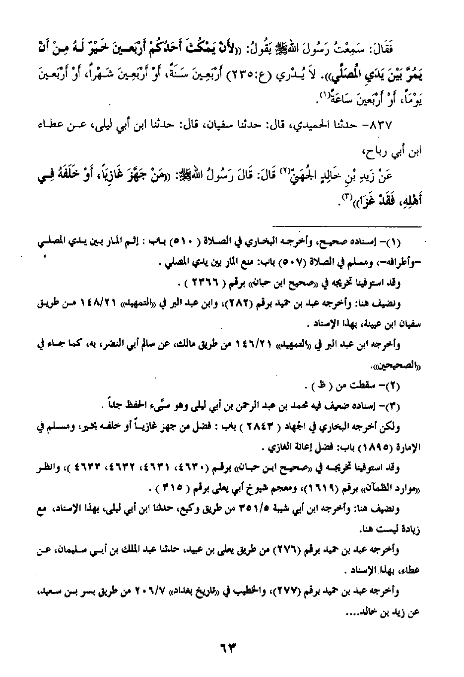837 - حَدَّثَنَا الْحُمَيْدِيُّ قَالَ: ثنا سُفْيَانُ، قَالَ: ثنا ابْنُ أَبِي لَيْلَى، عَنْ عَطَاءِ بْنِ أَبِي رَبَاحٍ، عَنْ زَيْدِ بْنِ خَالِدٍ الْجُهَنِيِّ، قَالَ: قَالَ رَسُولُ اللَّهِ صَلَّى اللهُ عَلَيْهِ وَسَلَّمَ: «§مَنْ جَهَّزَ غَازِيًا أَوْ خَلَفَهُ فِي أَهْلِهِ، فَقَدْ غَزَا»