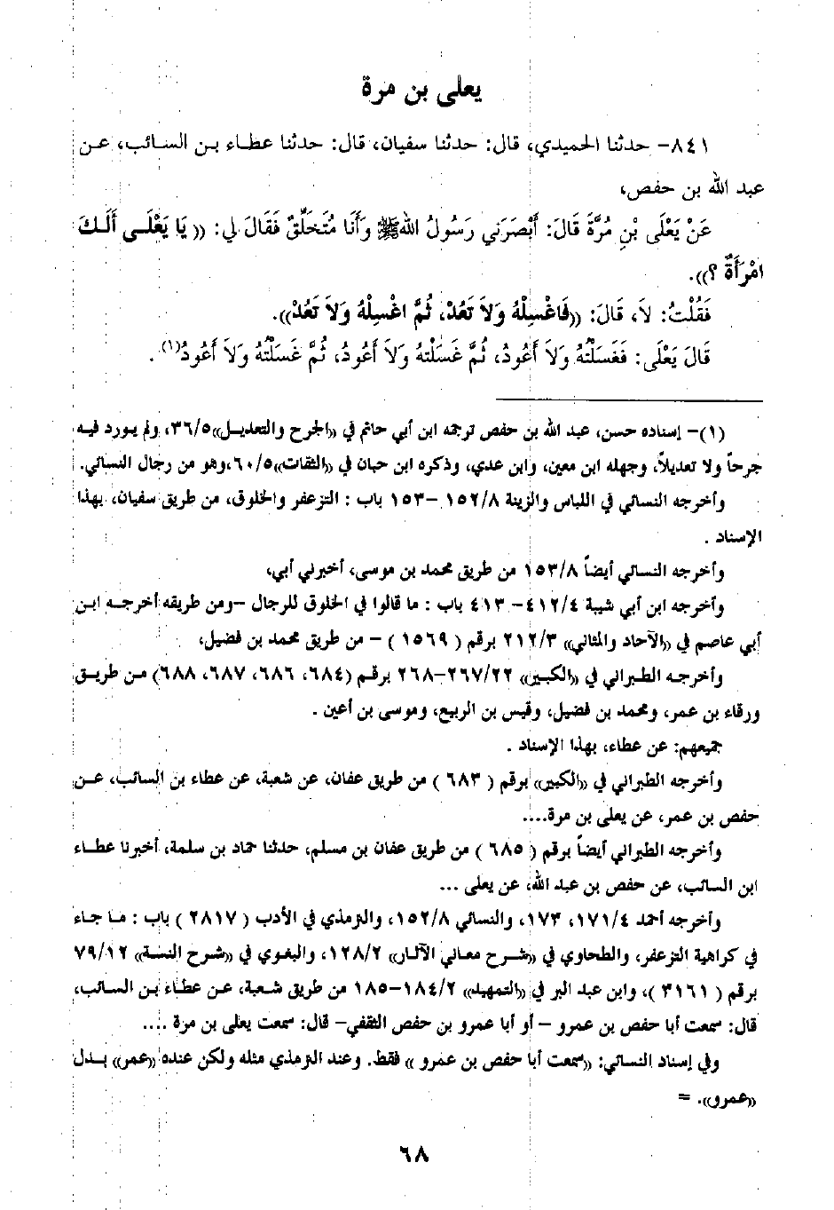 841 - حَدَّثَنَا الْحُمَيْدِيُّ قَالَ: ثنا سُفْيَانُ، قَالَ: ثنا عَطَاءُ بْنُ السَّائِبِ، عَنْ عَبْدِ اللَّهِ بْنِ حَفْصٍ، عَنْ يَعْلَى بْنِ مُرَّةَ، قَالَ: أَبْصَرَنِي رَسُولُ اللَّهِ صَلَّى اللهُ عَلَيْهِ وَسَلَّمَ وَأنَا مُتَخَلِّقٌ، فَقَالَ لِي: «يَا يَعْلَى، §أَلَكَ امْرَأَةٌ؟» ، فَقُلْتُ: لَا، قَالَ: «فَاغْسِلْهُ وَلَا تَعُدْ، ثُمَّ اغْسِلْهُ وَلَا تَعُدْ» قَالَ يَعْلَى: «فَغَسَلْتُهُ وَلَا أَعُودُ، ثُمَّ غَسَلْتُهُ وَلَا أَعُودُ، ثُمَّ غَسَلْتُهُ وَلَا أَعُودُ»