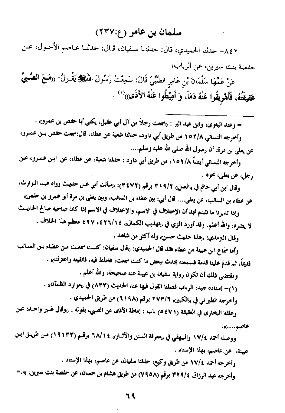842 - حَدَّثَنَا الْحُمَيْدِيُّ قَالَ: ثنا سُفْيَانُ، قَالَ: ثنا عَاصِمٌ الْأَحْوَلُ، عَنْ حَفْصَةَ بِنْتِ سِيرِينَ، عَنِ الرَّبَابِ، عَنْ عَمِّهَا سَلْمَانَ بْنِ عَامِرٍ الضَّبِّيِّ، قَالَ: سَمِعْتُ رَسُولَ اللَّهِ صَلَّى اللهُ عَلَيْهِ وَسَلَّمَ، يَقُولُ: «§مَعَ الصَّبِيِّ عَقِيقَةٌ فَأَهْرِيقُوا عَنْهُ دَمًا، وَأَمِيطُوا عَنْهُ الْأَذَى»