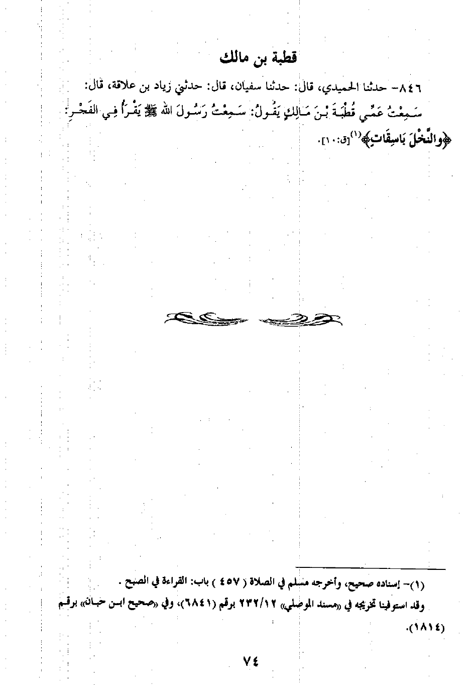 846 - حَدَّثَنَا الْحُمَيْدِيُّ قَالَ: ثنا سُفْيَانُ، قَالَ: ثني زِيَادُ بْنُ عِلَاقَةَ، قَالَ: سَمِعْتُ عَمِّي قُطْبَةَ بْنَ مَالِكٍ، يَقُولُ: " سَمِعْتُ رَسُولَ اللَّهِ صَلَّى اللهُ عَلَيْهِ وَسَلَّمَ §يَقْرَأُ فِي الْفَجْرِ: وَالنَّخْلَ بَاسِقَاتٍ "