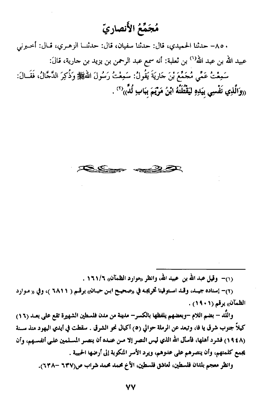 850 - حَدَّثَنَا الْحُمَيْدِيُّ قَالَ: ثنا سُفْيَانُ، قَالَ: ثنا الزُّهْرِيُّ، قَالَ: أَخْبَرَنِي عُبَيْدُ اللَّهِ بْنُ عَبْدِ اللَّهِ بْنِ ثَعْلَبَةَ، أَنَّهُ سَمِعَ عَبْدِ الرَّحْمَنِ بْنِ يَزِيدَ بْنِ جَارِيَةَ، قَالَ: سَمِعْتُ عَمِّي مُجَمِّعَ بْنَ جَارِيَةَ، يَقُولُ: سَمِعْتُ رَسُولَ اللَّهِ صَلَّى اللهُ عَلَيْهِ وَسَلَّمَ §وَذَكَرَ الدَّجَّالَ، فَقَالَ: «وَالَّذِي نَفْسِي بِيَدِهِ لَيَقْتُلَهُ ابْنُ مَرْيَمَ بِبَابِ لُدٍّ»