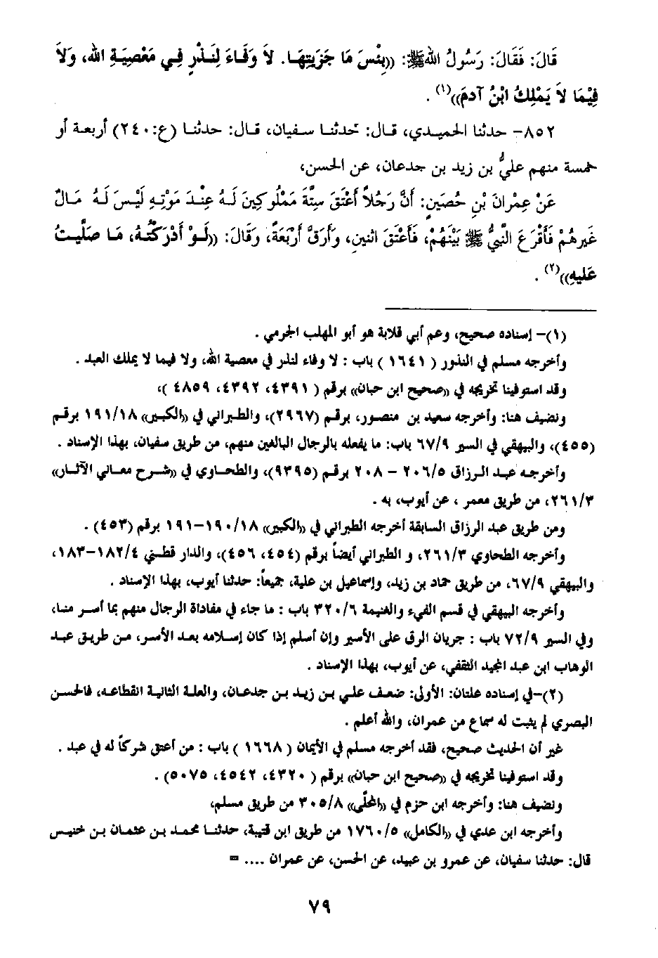 852 - حَدَّثَنَا الْحُمَيْدِيُّ قَالَ: ثنا سُفْيَانُ، قَالَ: ثنا أَرْبَعَةٌ أَوْ خَمْسَةٌ مِنْهُمْ عَلِيُّ بْنُ زَيْدِ بْنِ جُدْعَانَ، عَنِ الْحَسَنِ، عَنْ عِمْرَانَ بْنِ حُصَيْنٍ، أَنَّ رَجُلًا أَعْتَقَ سِتَّةَ مَمْلُوكِينَ لَهُ عِنْدَ مَوْتِهِ لَيْسَ لَهُ مَالٌ غَيْرَهُمْ، فَأَقْرَعَ النَّبِيُّ صَلَّى اللهُ عَلَيْهِ وَسَلَّمَ بَيْنَهُمْ فَأَعْتَقَ اثْنَيْنِ وَأَرَقَّ أَرْبَعَةً، وَقَالَ: «§لَوْ أَدْرَكْتُهُ مَا صَلَّيْتُ عَلَيْهِ»