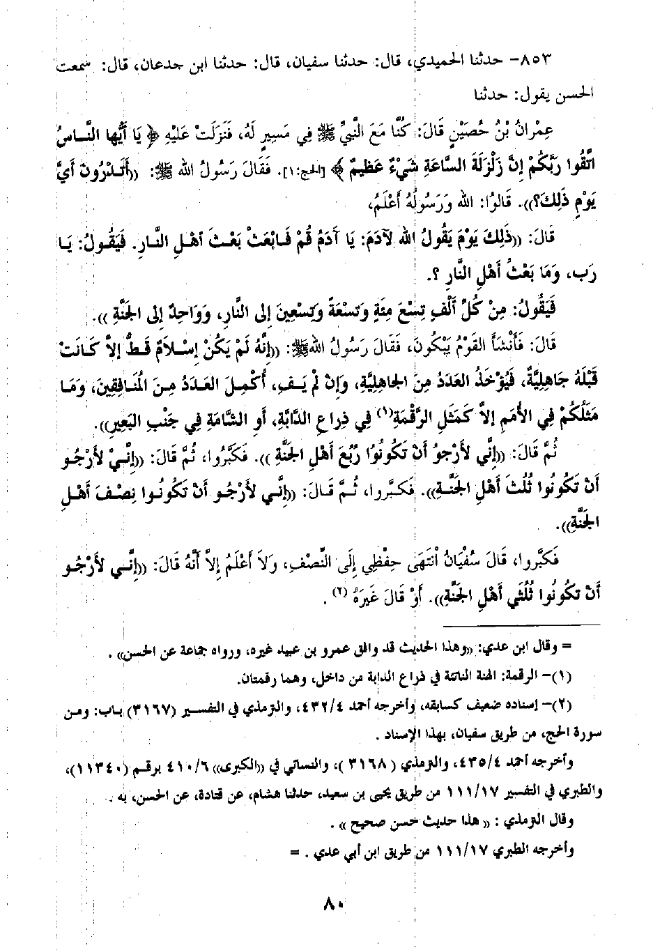 853 - حَدَّثَنَا الْحُمَيْدِيُّ قَالَ: ثنا سُفْيَانُ، قَالَ: ثنا ابْنُ جُدْعَانَ، قَالَ: سَمِعْتُ الْحَسَنَ، يَقُولُ: ثنا عِمْرَانُ بْنُ حُصَيْنٍ، قَالَ: كُنَّا مَعَ النَّبِيِّ صَلَّى اللهُ عَلَيْهِ وَسَلَّمَ فِي مَسِيرٍ لَهُ، فَنَزَلَتْ عَلَيْهِ: {يَا أَيُّهَا النَّاسُ اتَّقُوا رَبَّكُمْ إِنَّ زَلْزَلَةَ السَّاعَةِ شَيْءٌ عَظِيمٌ} [الحج: 1] ، فَقَالَ رَسُولُ اللَّهِ صَلَّى اللهُ عَلَيْهِ وَسَلَّمَ: «تَدْرُونَ أَيُّ يَوْمٍ ذَلِكَ؟» قَالُوا: اللَّهُ وَرَسُولُهُ أَعْلَمُ، قَالَ: " ذَلِكَ يَوْمٌ يَقُولُ اللَّهُ لِآدَمَ: §يَا آدَمُ قُمْ فَابْعَثْ بَعْثَ أَهْلِ النَّارِ، فَيَقُولُ: رَبَّ مَا بَعْثُ أَهْلِ النَّارِ؟ فَيَقُولُ: مِنْ كُلِّ أَلْفٍ تِسْعُمِائَةٍ وَتِسْعَةٌ وَتِسْعُونَ إِلَى النَّارِ، وَوَاحِدٌ إِلَى الْجَنَّةِ، قَالَ: فَأَنْشَأَ الْقَوْمُ يَبْكُونَ "، فَقَالَ رَسُولُ اللَّهِ صَلَّى اللهُ عَلَيْهِ وَسَلَّمَ: «أَنَّهُ لَمْ يَكُنْ إِسْلَامٌ قَطُّ إِلَّا كَانَتْ قَبْلَهُ جَاهِلِيَّةٌ فَيَؤْخَذُ الْعَدَدُ مِنَ الْجَاهِلِيَّةِ، وَإِنْ لَمْ يَفِ أُكْمِلَ الْعَدَدُ مِنَ الْمُنَافِقينَ، وَمَا مَثَلُكُمْ فِي الْأُمَمِ إِلَّا كَمَثَلٍ الرَّقْمِ فِي ذِرَاعِ الدَّابَّةِ، أَوِ الشَّامَةِ فِي جَنْبِ الْبَعِيرِ» ، ثُمَّ قَالَ: «إِنِّي لَأَرْجُو أَنْ تَكُونُوا رُبْعَ أَهْلِ الْجَنَّةِ» ، فَكَبَّرُوا، ثُمَّ قَالَ: «إِنِّي لَأَرْجُو أَنْ تَكُونُوا ثُلُثَ أَهْلِ الْجَنَّةِ» فَكَبَّرُوا، ثُمَّ قَالَ: «إِنِّي لَأَرْجُو أَنْ تَكُونُوا نِصْفَ أَهْلِ الْجَنَّةِ» فَكَبَّرُوا. قَالَ سُفْيَانُ: انْتَهَى حِفْظِي إِلَى النِّصْفِ، وَلَا أَعْلَمُ إِلَّا أَنَّهُ قَالَ: «إِنِّي لَأَرْجُو أَنْ تَكُونُوا ثُلُثَيْ أَهْلِ الْجَنَّةِ» ، أَوْ قَالَ غَيْرَهُ