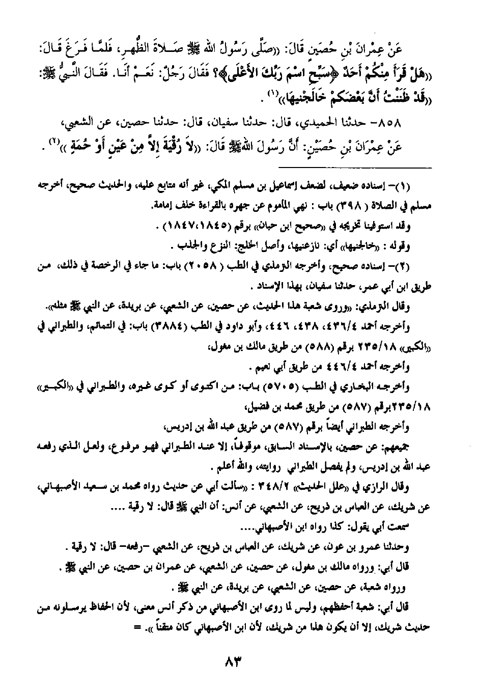 858 - حَدَّثَنَا الْحُمَيْدِيُّ قَالَ: ثنا سُفْيَانُ، قَالَ: ثنا حُصَيْنٌ، عَنِ الشَّعْبِيِّ، عَنْ عِمْرَانَ بْنِ حُصَيْنٍ، أَنَّ رَسُولَ اللَّهِ صَلَّى اللهُ عَلَيْهِ وَسَلَّمَ، قَالَ: «§لَا رُقْيَةَ إِلَّا مِنْ عَيْنٍ أَوْ حُمَةٍ»