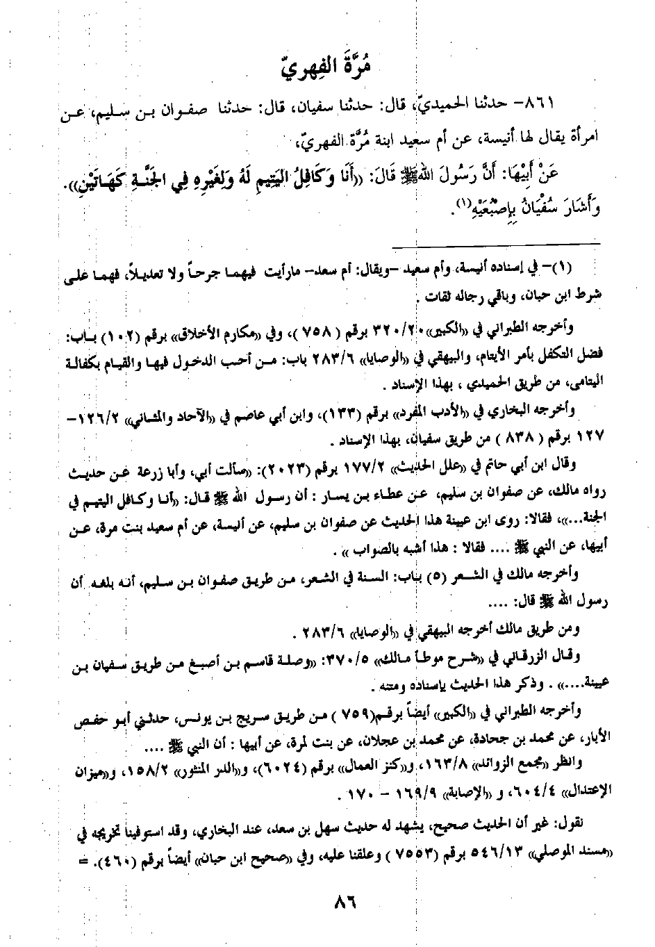 861 - حَدَّثَنَا الْحُمَيْدِيُّ قَالَ: ثنا سُفْيَانُ، قَالَ: ثنا صَفْوَانُ بْنُ سُلَيْمٍ، عَنِ امْرَأَةٍ يُقَالُ لَهَا أُنَيْسَةُ، عَنْ أُمِّ سَعِيدِ ابْنَةِ مُرَّةَ الْفِهْرِيِّ، عَنْ أَبِيهَا، أَنَّ رَسُولَ اللَّهِ صَلَّى اللهُ عَلَيْهِ وَسَلَّمَ، قَالَ: «§أَنَا وَكَافِلُ الْيَتِيمِ لَهُ وَلِغَيْرِهِ فِي الْجَنَّةِ كَهَاتَيْنِ» وَأَشَارَ سُفْيَانُ بِإِصْبَعَيْهِ