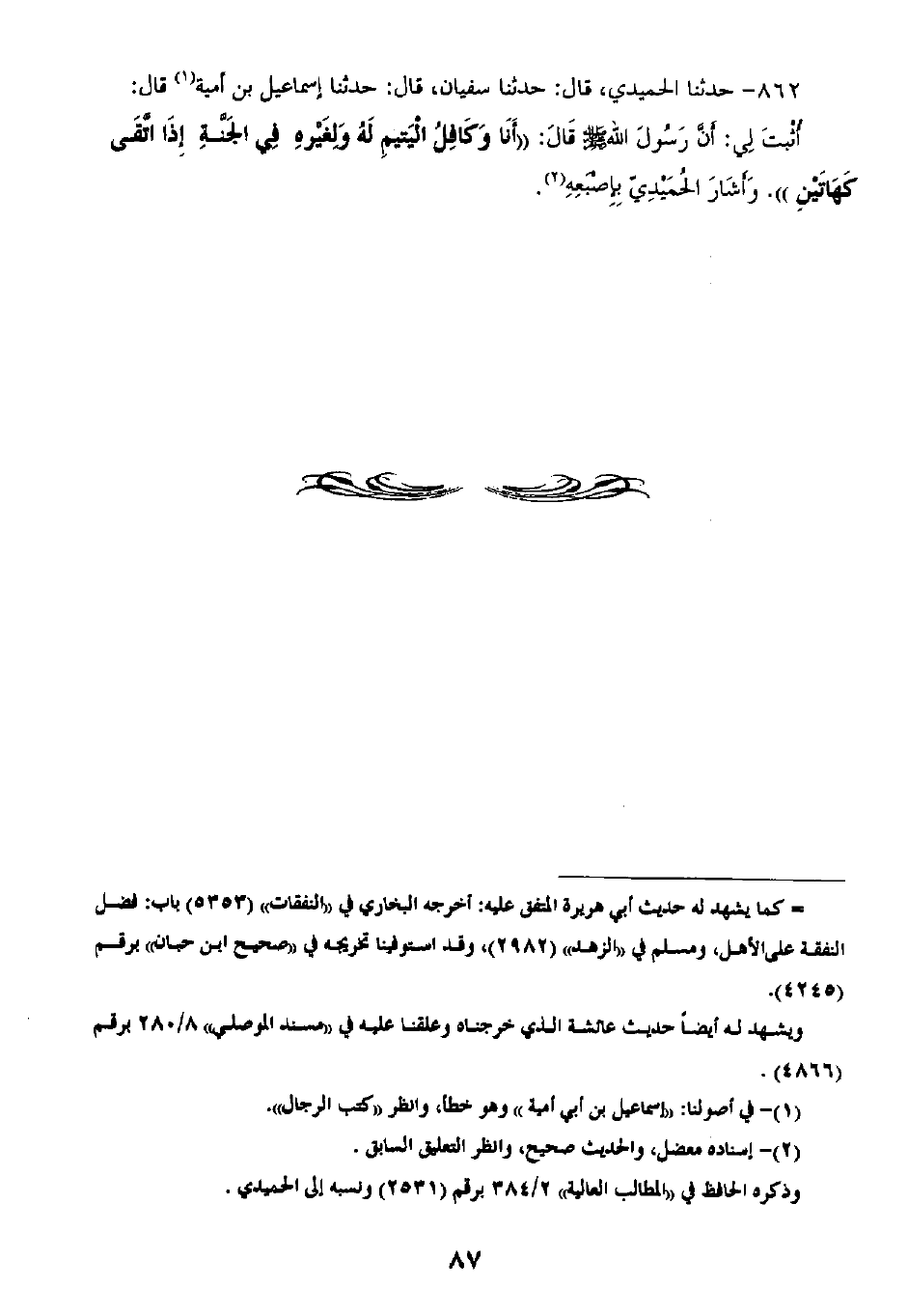 862 - حَدَّثَنَا الْحُمَيْدِيُّ قَالَ: ثنا سُفْيَانُ، قَالَ: ثنا إِسْمَاعِيلُ بْنُ أَبِي أُمَيَّةَ، قَالَ: أُثْبِتَ لِي أَنَّ رَسُولَ اللَّهِ صَلَّى اللهُ عَلَيْهِ وَسَلَّمَ، قَالَ: «§أَنَا وَكَافِلُ الْيَتِيمِ لَهُ وَلِغَيْرِهِ فِي الْجَنَّةِ إِذَا اتَّقَى كَهَاتَيْنِ» وَأَشَارَ الْحُمَيْدِيُّ بِإِصْبَعِهِ