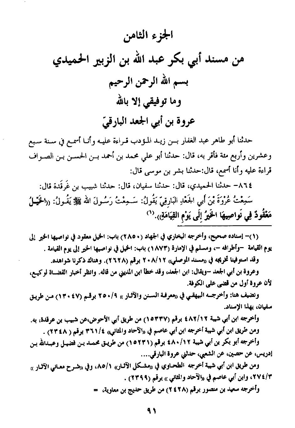 864 - حَدَّثَنَا الْحُمَيْدِيُّ قَالَ: ثنا سُفْيَانُ، قَالَ: ثنا شَبِيبُ بْنُ غَرْقَدَةَ، قَالَ: سَمِعْتُ عُرْوَةَ بْنِ أَبِي الْجَعْدِ الْبَارِقِيِّ، يَقُولُ: سَمِعْتُ رَسُولَ اللَّهِ صَلَّى اللهُ عَلَيْهِ وَسَلَّمَ، يَقُولُ: «§الْخَيْلُ مَعْقُودٌ فِي نَوَاصِيهَا الْخَيْرُ إِلَى يَوْمٍ الْقِيَامَةٍ» -[92]-