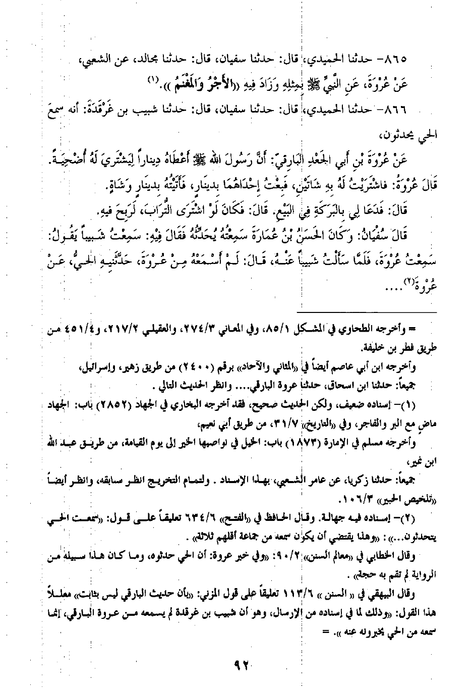 866 - حَدَّثَنَا الْحُمَيْدِيُّ قَالَ: ثنا سُفْيَانُ، قَالَ: ثنا شَبِيبُ بْنُ غَرْقَدَةَ، أَنَّهُ سَمِعَ الْحَيَّ يُحَدِّثونَ، عَنْ عُرْوَةَ بْنِ أَبِي الْجَعْدِ الْبَارِقِيِّ، أَنَّ رَسُولَ اللَّهِ صَلَّى اللهُ عَلَيْهِ وَسَلَّمَ أَعْطَاهُ دِينَارًا لِيَشْتَرِيَ لَهُ أُضْحِيَةً، قَالَ عُرْوَةُ: فَاشْتَرَيْتُ لَهُ بِهِ شَاتَيْنِ، فَبِعْتُ إِحْدَاهُمَا بِدِينَارٍ، فَأَتَيْتُهُ بِدِينَارٍ، وَشَاةٍ، «§فَدَعَا لِي بِالْبَرَكَةِ فِي الْبَيْعِ» قَالَ: «وَكَانَ لَوِ اشْتَرَى التُّرَابَ لَرَبِحَ فِيهِ» ، قَالَ سُفْيَانُ: وَكَانَ الْحَسَنُ بْنُ عُمَارَةَ سَمِعْتُهُ يُحَدِّثُهُ، فَقَالَ فِيهِ: سَمِعْتُ شَبِيبًا، يَقُولُ: سَمِعْتُ عُرْوَةَ، فَلَمَّا سَأَلْتُ شَبِيبًا، قَالَ: لَمْ أَسْمَعْهُ مِنْ عُرْوَةَ، حَدَّثَنِيهِ الْحَيُّ عَنْ عُرْوَةَ