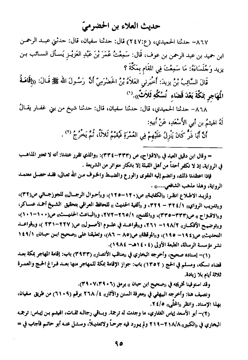 867 - حَدَّثَنَا الْحُمَيْدِيُّ قَالَ: ثنا سُفْيَانُ، قَالَ: ثنا عَبْدُ الرَّحْمَنِ بْنُ حُمَيْدِ بْنِ عَبْدِ الرَّحْمَنِ بْنِ عَوْفٍ، قَالَ: سَمِعْتُ عُمَرَ بْنَ عَبْدِ الْعَزِيزِ، يَسْأَلُ السَّائِبَ بْنَ يَزِيدَ، وَجُلَسَاءَهُ، مَا سَمِعْتَ فِي الْمَقَامِ بِمَكَّةَ؟ قَالَ: السَّائِبُ بْنُ يَزِيدَ: أَخْبَرَنِي الْعَلَاءُ بْنُ الْحَضْرَمِيِّ، أَنَّ رَسُولَ اللَّهِ صَلَّى اللهُ عَلَيْهِ وَسَلَّمَ، قَالَ: «§إِقَامَةُ الْمُهَاجِرِ بِمَكَّةَ بَعْدَ قَضَاءِ نُسُكِهِ ثَلَاثًا»
