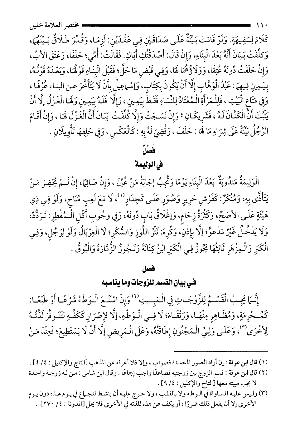 2- قال ابن عرفة: قسم الزوج بين زوجته فصاعدا واجب إجماعا وقال ابن شاس: من له زوجة واحدة لا يجب مبيته معها [التاج والإكليل: 4 / 9] .