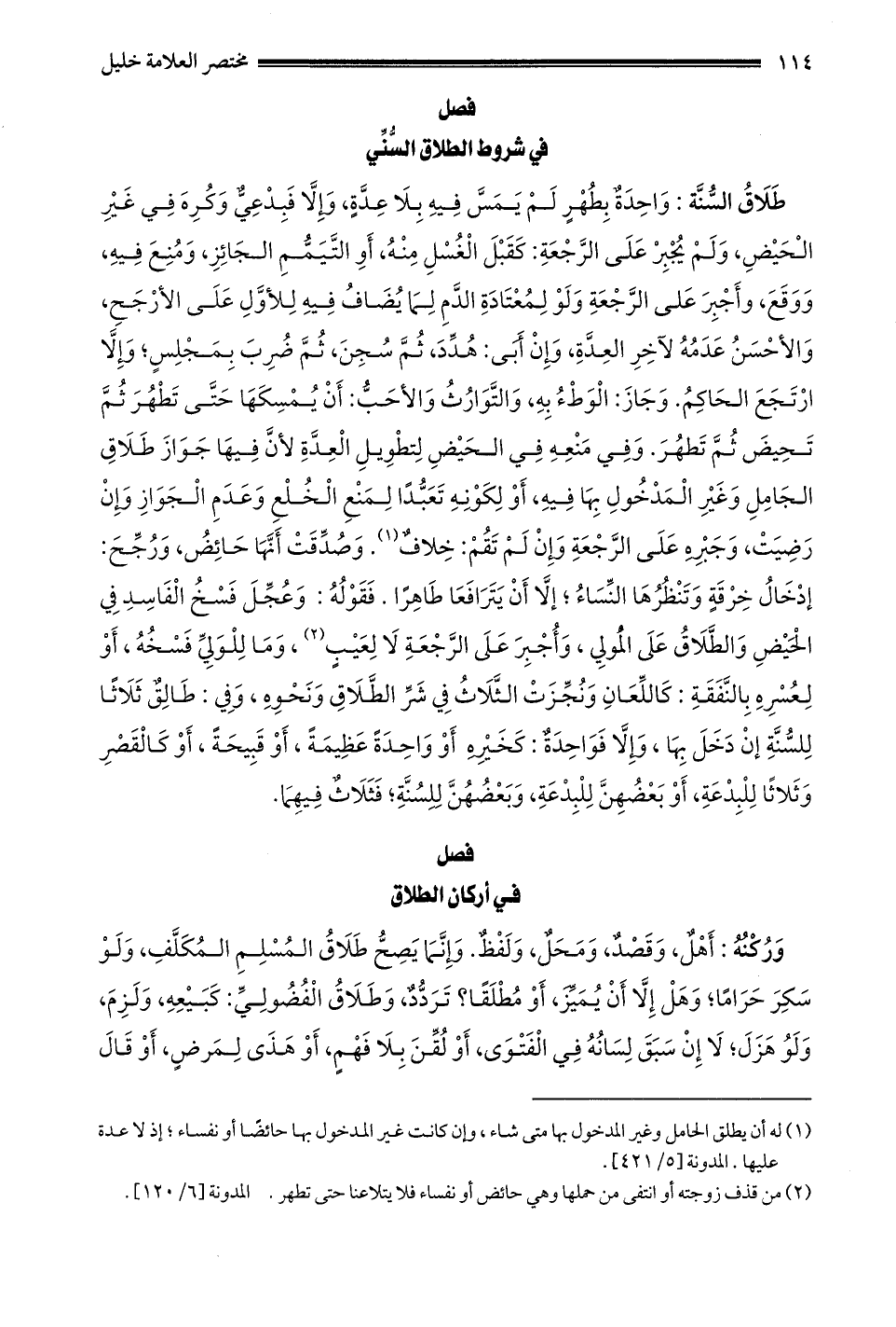 طلاق السنة: وَاحِدَةً بِطُهْرٍ لَمْ يَمَسَّ فِيهِ بِلَا عِدَّةٍ وإلا فبدعي وَكُرِهَ فِي غَيْرِ الْحَيْضِ وَلَمْ يُجْبَرْ عَلَى الرجعة: كقبل الغسل منه أو التيمم الجائز ومنع فيه ووقع وأجبر على الرجعة ولو لمعتادة الدم لما يضاف في للأول على الأرجح والأحسن عدمه لآخر العدة وَإِنْ أَبَى: هُدِّدَ ثُمَّ سُجِنَ ثُمَّ ضُرِبَ بمجلس وإلا ارتجع الحاكم وجاز: الوطء به والتوارث وَالْأَحَبُّ: أَنْ يُمْسِكَهَا حَتَّى تَطْهُرَ ثُمَّ تَحِيضَ ثم تطهر وَفِي مَنْعِهِ فِي الْحَيْضِ لِتَطْوِيلِ الْعِدَّةِ لِأَنَّ فيها جواز طلاق الجامل وَغَيْرِ الْمَدْخُولِ بِهَا فِيهِ أَوْ لِكَوْنِهِ تَعَبُّدًا لِمَنْعِ الْخُلْعِ وَعَدَمِ الْجَوَازِ وَإِنْ رَضِيَتْ وَجَبْرِهِ على الرجعة وإن لم تقم: خلاف1 وصدقت أنها حائض ورجح: إدخال خرقة وتنظرها النساء إلا أن يترافعا طاهرا فقوله: وعجل فسخ الفاسد في الحيض والطلاق على المولي وأجبر على الرجعة لا لعيب2 وما للولي فسخه أو لعسره بالنفقة: كاللعان ونجزت الثلاث في شر الطلاق ونحوه وَفِي: طَالِقٍ ثَلَاثًا لِلسُّنَّةِ إنْ دَخَلَ بِهَا وإلا فواحدة: كَخَيْرِهِ أَوْ وَاحِدَةٍ عَظِيمَةٍ أَوْ قَبِيحَةٍ أَوْ كالقصر وثلاثا لِلْبِدْعَةِ أَوْ بَعْضُهُنَّ لِلْبِدْعَةِ وَبَعْضُهُنَّ لِلسُّنَّةِ فَثَلَاثٌ فيهما.