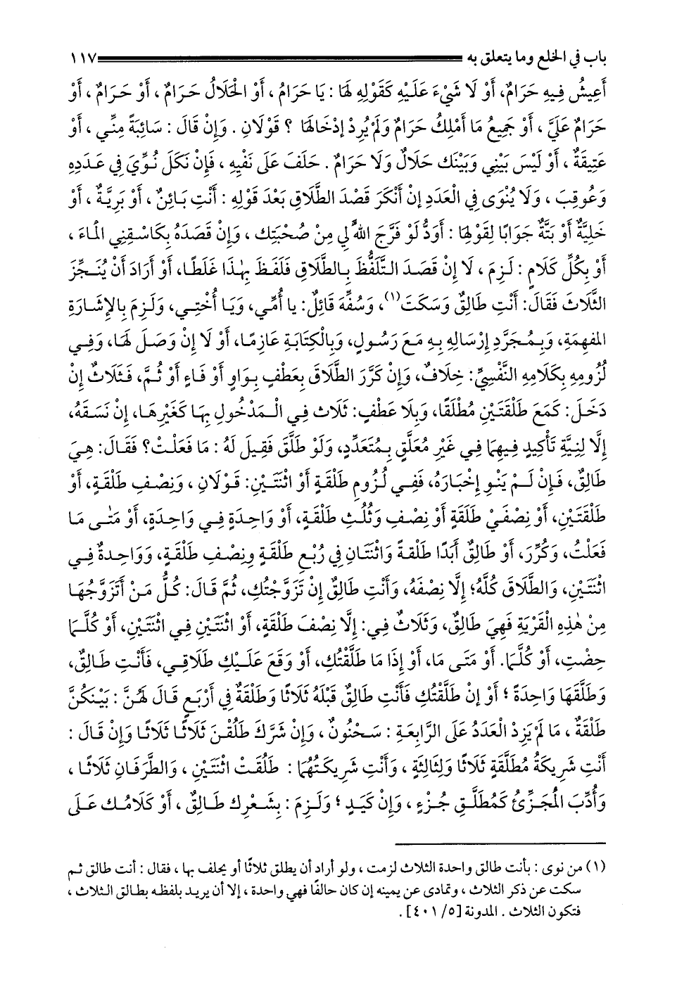 1- من نوى: بأنت طالق واحدة الثلاث لزمت ولو أراد أن يطلق ثلاثا أو يحلف بها فقال: أنت طالق ثم سكت عن ذكر الثلاث وتمادى عن يمينه إن كان حالفا فهي واحدة إلا أن يريد بلفظه بطالق الثلاث فتكون الثلاث. المدونة [5 / 401] .