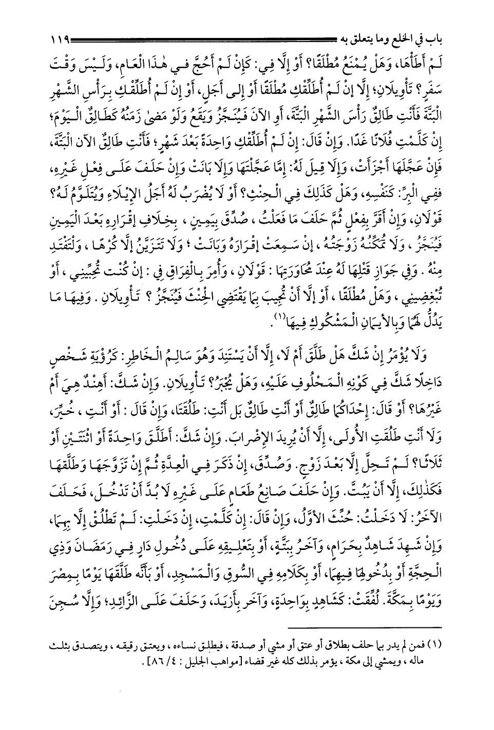 لم أطأها وَهَلْ يُمْنَعُ مُطْلَقًا؟ أَوْ إلَّا فِي: كَإِنْ لَمْ أَحُجَّ فِي هَذَا الْعَامِ وَلَيْسَ وَقْتَ سفر؟ تأويلان إلَّا إنْ لَمْ أُطَلِّقْكِ مُطْلِقًا أَوْ إلَى أجل أو إن لم أطلقك برأس الشَّهْرِ أَلْبَتَّةَ فَأَنْتِ طَالِقٌ رَأْسَ الشَّهْرِ أَلْبَتَّةَ أو الآن فينجز ويقع ولو مضى زمنه كطالق اليوم إن كلمت فلانا غدا وَإِنْ قَالَ: إنْ لَمْ أُطَلِّقْكِ وَاحِدَةً بَعْدَ شَهْرٍ فَأَنْتِ طَالِقٌ الْآنَ أَلْبَتَّةَ فَإِنْ عَجَّلَهَا أَجْزَأَتْ وَإِلَّا قِيلَ لَهُ: إمَّا عَجَّلْتهَا وَإِلَّا بانت وَإِنْ حَلَفَ عَلَى فِعْلِ غَيْرِهِ فَفِي الْبِرِّ: كَنَفْسِهِ وَهَلْ كَذَلِكَ فِي الْحِنْثِ؟ أَوْ لَا يُضْرَبُ لَهُ أَجَلُ الْإِيلَاءِ وَيُتَلَوَّمُ لَهُ؟ قَوْلَانِ وَإِنْ أَقَرَّ بِفِعْلٍ ثُمَّ حَلَفَ مَا فَعَلْت صدق بيمين بخلاف إقراره بعد اليمين فينجز وَلَا تُمَكِّنُهُ زَوْجَتُهُ إنْ سَمِعَتْ إقْرَارَهُ وَبَانَتْ ولا تتزين إلا كرها وَلْتَفْتَدِ مِنْهُ وَفِي جَوَازِ قَتْلِهَا لَهُ عِنْدَ محاورتها: قولان وَأُمِرَ بِالْفِرَاقِ فِي: إنْ كُنْت تُحِبِّينِي أَوْ تبغضني وَهَلْ مُطْلَقًا أَوْ إلَّا أَنْ تُجِيبَ بِمَا يقتضي الحنث فينجز؟ تأويلان وفيها ما يدل لهما وبالأيمان المشكوك فيها1.